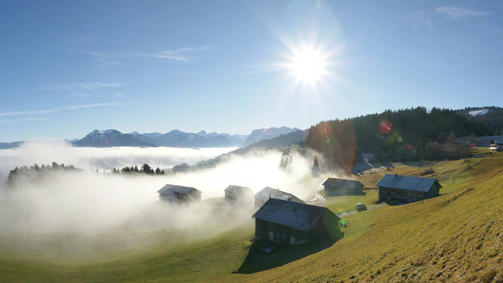 C Herbststimmung am Bödele, mit Blick auf den Nebel im Tal, bunten Bäume im Hintergrund