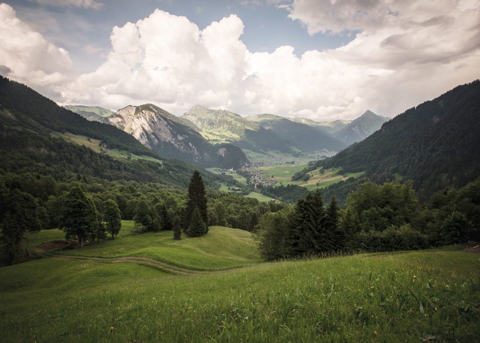 Die Wanderung führt danach bergauf durch den Wald zum Auer Ried. Hier blühen im Frühling sagenhafte Blumenwiesen. Der traumhafte Blick auf Au und Schoppernau fesselt mich immer wieder. Das ist meine Energietankstelle. Dann geht’s wieder bergab ins Tal und am Bach entlang zurück zum Hotel.