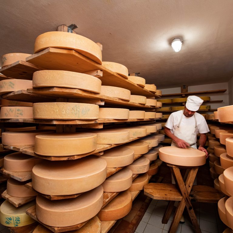 „Rund zehn Liter Milch ergeben ein Kilo Käse“, rechnet Werner vor. „In einer Saison komm ich auf knapp 300 Laib Käse.“ Wow! Ein Teil davon lagert im Keller. Auch dort muss Werner ständig ran. Prüfen, säubern, wenden, salzen. Es gibt viel zu tun. Und dann sind da ja noch Wanderer, die den Alpkäse auf der Veranda verkosten wollen. Mit Brot und Trauben garniert, munden die frisch produzierten Käsewürfel nämlich vorzüglich. Liegt es an der Handarbeit? An den von den Kühen verspeisten Kräutern, die das würzige Aroma ausmachen? Am Blick auf die Berge? Während die meisten Gäste nach der Brotzeit (und womöglich einem Schnaps) aufbrechen, kann man auch noch bleiben, um Werner beim Käsen über die Schulter zu schauen – im Rahmen des wöchentlichen geführten „Alpgangs“.