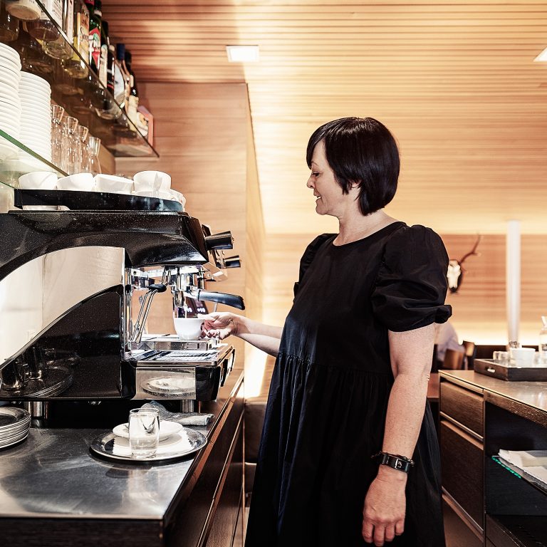 Die Holz-getäfelten Bregenzerwälder Gaststuben sind Kulturgut, sie verkörpern Geborgenheit und zelebriertes Gastgeben. Genau diese Qualitäten finden sich im renovierten „Angelikahöhe“ wieder. Typologisch gesehen entspricht das beliebte Kaffeehaus zwar nicht der Stube, Details, Mobiliar und Oberflächen wurden allerdings mit der gleichen Achtsamkeit ins Zeitgenössische übersetzt wie bei historischen Vorbildern. Drei Bereiche laden die bunte Mischung an heimisch-internationalen Stammgästen und solchen, die es werden könnten, ein, das Tortensortiment zu verkosten: dem Dorf zugewandt und hell der Eingangsbereich, informell und leger die Sitzgelegenheit bei der Bar, intim und gediegen die Stube im Hausinneren.