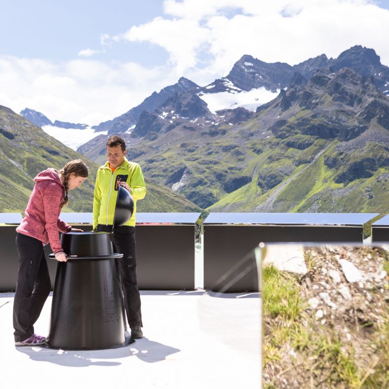 Was seit 2019 auf der Bielerhöhe jedenfalls zum Pflichtprogramm gehört, ist ein Blick in den Schützenschacht. Die Brüstung ist mit hochpoliertem Edelstahl eingefasst, in dem sich Berge, Himmel und Wolken spiegeln. In der Mitte das „Fernrohr“: Deckel öffnen, den Kopf mutig hineinstecken und Licht und Sound auf sich wirken lassen. Fluter, Projektoren, LED-Lines und Lautsprecher nehmen dem Abgrund seinen Schrecken. Am Schluss ist man verzaubert, von der Kunst und von der Natur.