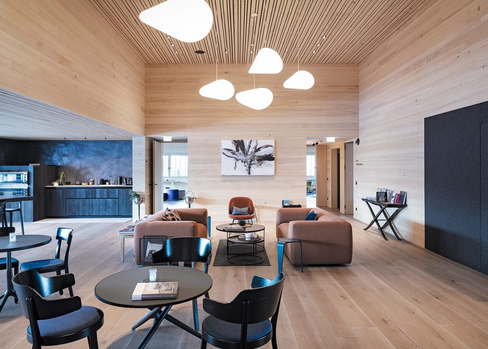 Als Anleihe für die bauliche Übersetzung ihres Ganzjahreskonzepts dient das traditionelle Vorsäß – eine kollektiv bewirtschaftete Ansammlung von Hütten und Ställen zwischen Tal und Alpe. Analog dazu bilden einfache Holzbauten mit Satteldach eine lose, von Gelassenheit getragene Formation. Umso raffinierter tut sich die innere Welt dieser Bauten in bewährter Holzbaukunst auf: Im zentralen Gastraum des Haupthauses heißt ein großzügiger Holztisch willkommen, bei Bar und Lounge vor dem Kachelofen mischen sich Jung und Alt, Hausgäste und Ausflügler. Auch die SeminarteilnehmerInnen vom ersten Stock gesellen sich dazu, können auswählen zwischen intimeren Stuben oder großem Speiseraum. Das Ambiente ist hell und freundlich, die Ausführungsqualität und die eingesetzten Materialien sind hochwertig und die Beleuchtung schafft abends wohltuende Atmosphäre.