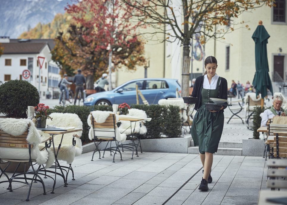 Der Taube-Gastgarten ist legendär, seit 300 Jahren. Alte Kastanienbäume, knirschender Kies und klassisches Mobiliar machen dem großzügigen Gastgarten alle Ehre. Offen für Einheimische, Hotel- und Stammgäste, spontane Tagesausflügler und Wanderer ist auch kulinarisch für eine gute Durchmischung an der frischen Luft gesorgt. Im Sommer spenden die Bäume wohltuend kühlenden Schatten, im Winter strahlt die Sonne auf die offene Terrasse am Eck, mit vollem Blick auf den geschäftigen Kirchplatz. Hier wie da lässt sich´s gut verweilen, mit einem guten Wein im Glas und wunderbarem Kaiserschmarren auf dem Teller.