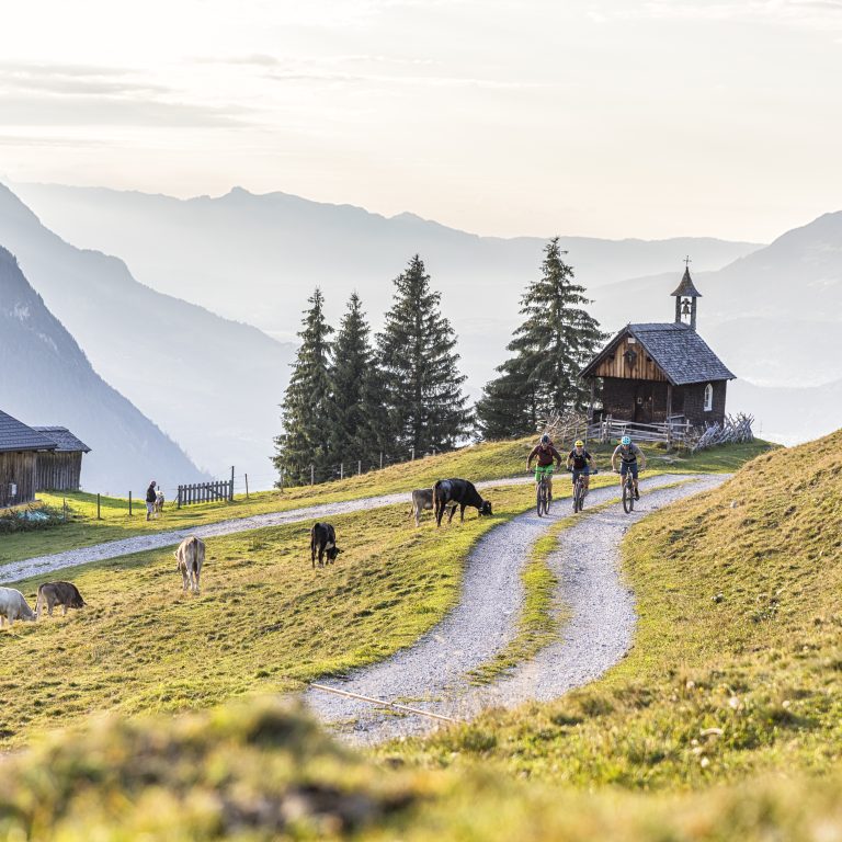 Wir sind zu Gast in der vielfältigen Kulturlandschaft und somit nicht die einzigen, die den Sommer in den Bergen genießen – auch Kühe verbringen den Sommer auf den hochgelegenen Alpwiesen. Damit die Tiere nicht gestört werden, gestalte deinen Aufenthalt möglichst ruhig. Unsere Tipps: Bleib stets auf dem Weg und halte mindestens 15 Meter Abstand zur Herde. Sollte das nicht möglich sein, steig ab und schiebe dein Bike ruhig an der Herde vorbei. Wenn du ein Gatter öffnest, schließe es hinter dir wieder – das Alppersonal wird es dir danken. Außerdem: Das Trinkwasser auf unseren Alpen ist im Sommer ein kostbares Gut. Die Trinkwasserbrunnen für Vieh und auch Menschen sind nicht als Waschplatz für dein Bike gedacht!