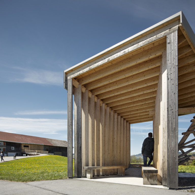 The 1,000-strong village of Krumbach lies right at the heart of the beautiful countryside of Vorarlberg. The culture of building and sound craftsmanship go back a long way here – as can already be seen in the neat and tidy village hall and parsonage. “Public transport plays an important role in rural life,” says the cosmopolitan local mayor (ret.) Arnold Hirschbühl, who loves his village all the more for all his travels. “The yellow country bus serves the village every 30 to 60 minutes.” When talk in the pub turned one day to the long overdue replacement of the village’s seven bus shelters, somebody had the bright idea of connecting the culture of building with everyday mobility and making a stand against cuts in “unprofitable” bus routes in rural areas – while at the same time bringing the big wide world of architecture to Krumbach.