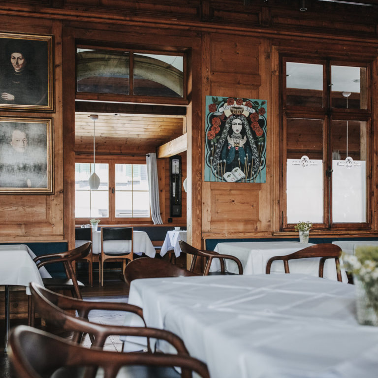 The way to the guest areas takes us up the stairs, along the narrow passage to the parlour immediately beside the main entrance of the ‘Hirschen’. As anyone who ever stayed here knows, the cosy atmosphere makes it a wonderful place to relax and treat yourself. Jonathan Burger takes a seat on a corner bench and reflects on developments in the culinary world. “I don’t follow trends,” he explains, “but I am taking an increasingly minimalist approach. In recent years, I think there were generally too many components on the plate. We have to prepare menus, sometimes for small groups and sometimes for one hundred or more people. Reducing our focus means that there is little left over, everything gets used up.” He and his team create their own recipes. He sums up his approach as follows: “I haven’t looked at cookbooks in months, that is the most important thing I have learned. It inspires me to be more creative. I have been reading more specialist literature, for example on preserving and fermenting.” Of course the menu also contains traditional dishes like Schnitzel, Kässpätzle (cheese spaetzle) and Riebel (corn semolina mash). “It’s not all about creativity. ‘Hirschen’ is a traditional establishment, where guests can enjoy Spaetzle, or boiled beef and a schnapps in winter after skiing. That is our mission.”