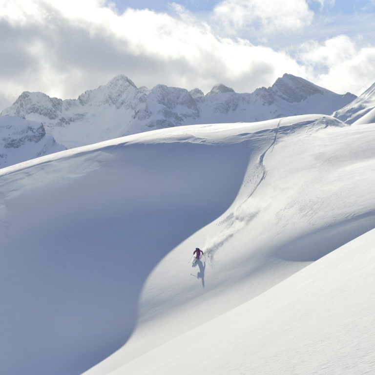 Wer die gesicherten Skipisten verlässt, der benötigt viel Erfahrung und entsprechendes Sicherheitsequipment. Mit der Kampagne „Respektiere deine Grenzen“ appelliert Vorarlberg an Skifahrer, sich abseits der Pisten sowohl im Sinne des Umweltschutzes als auch auf die eigene Sicherheit bedacht zu verhalten. Am besten ist man mit einem ortskundigen Guide unterwegs! Unverzichtbar ist eine Lawinengrundausrüstung mit Lawinenverschütteten-Suchgerät (LVS), Lawinensonde und -schaufel, wobei der Umgang damit vorab geübt werden muss. Zusätzlich empfiehlt sich das Tragen eines Rucksacks mit integriertem Lawinen-Airbag. Den Spaß im Tiefschnee erhöhen Freeride-Ski – je breiter, desto besser der Auftrieb. Wer auf den Ski eine Tourenbindung montiert, der muss einen Kompromiss zwischen Fahrspaß und Gewicht finden. Denn je breiter und damit schwerer der Ski ist, umso anstrengender wird‘s natürlich bergauf.