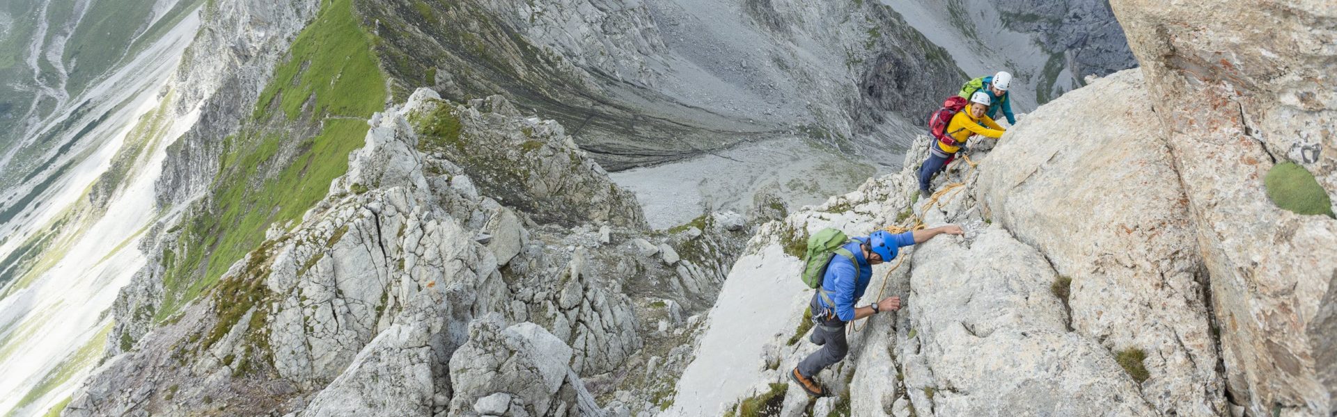 Ein Bergführer klettert mit zwei Kletterern gesichert an einem Seil in einer Felswand. Sie tragen Helme, Klettergurt und Rucksack, halten sich mit den Händen an guten Griffen im Fels fest.