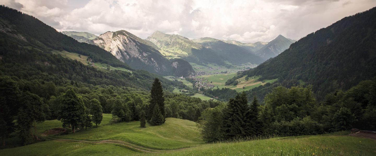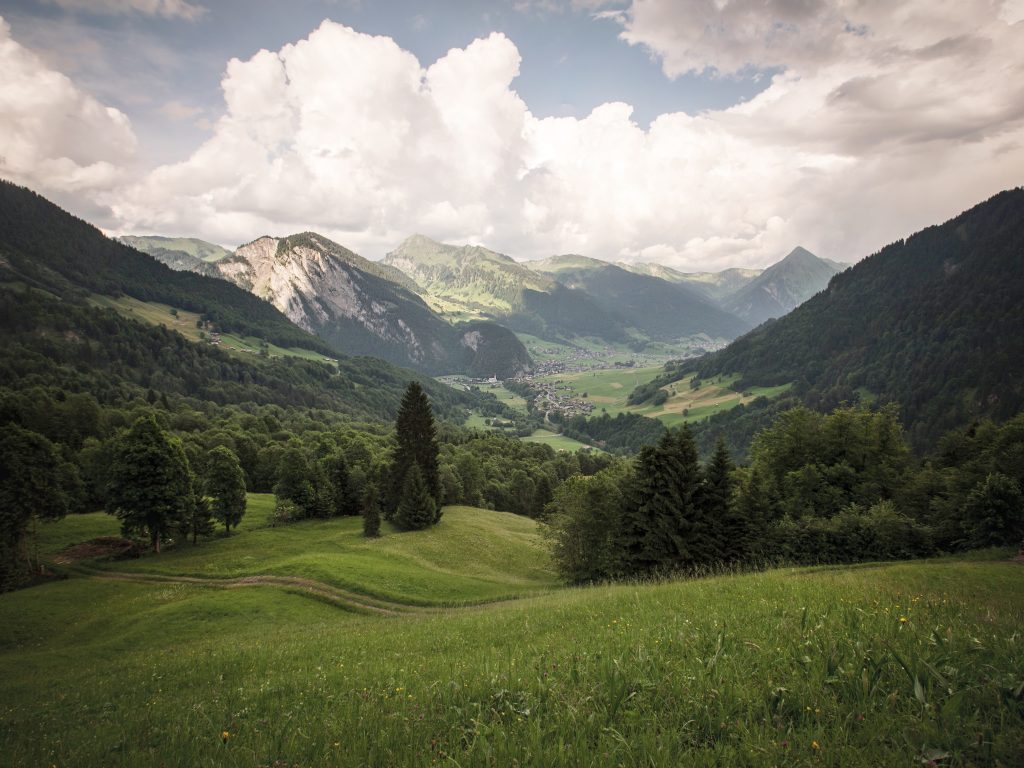 Die Wanderung führt danach bergauf durch den Wald zum Auer Ried. Hier blühen im Frühling sagenhafte Blumenwiesen. Der traumhafte Blick auf Au und Schoppernau fesselt mich immer wieder. Das ist meine Energietankstelle. Dann geht’s wieder bergab ins Tal und am Bach entlang zurück zum Hotel.