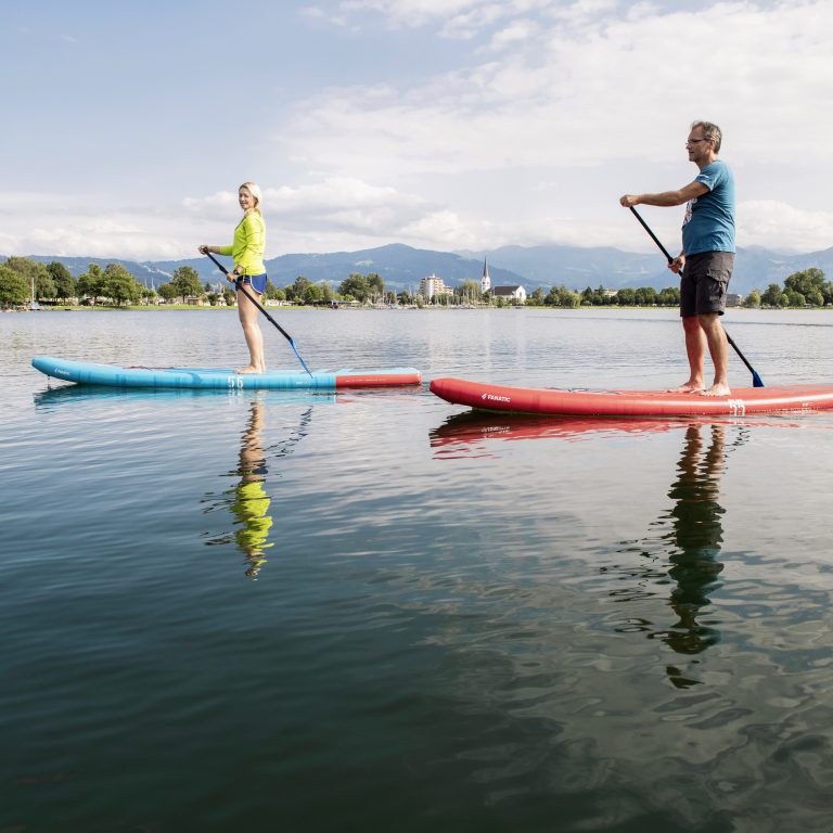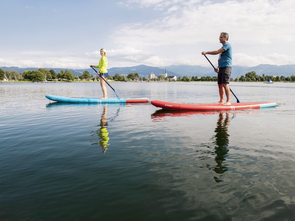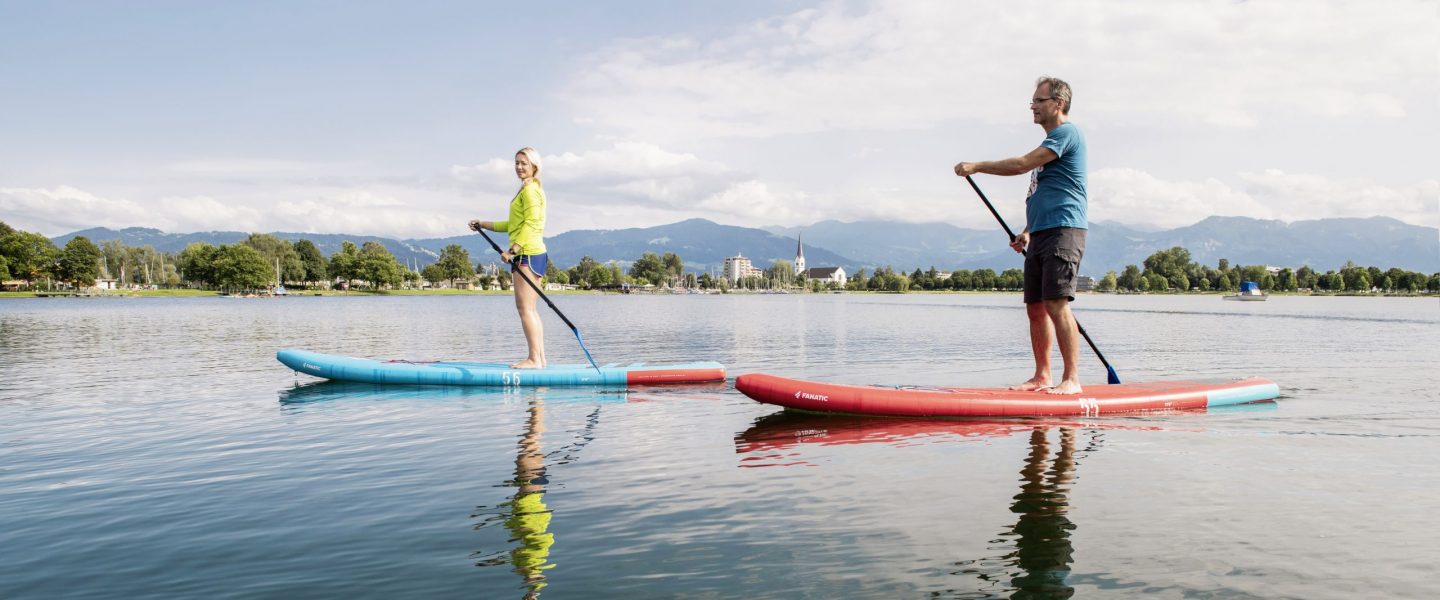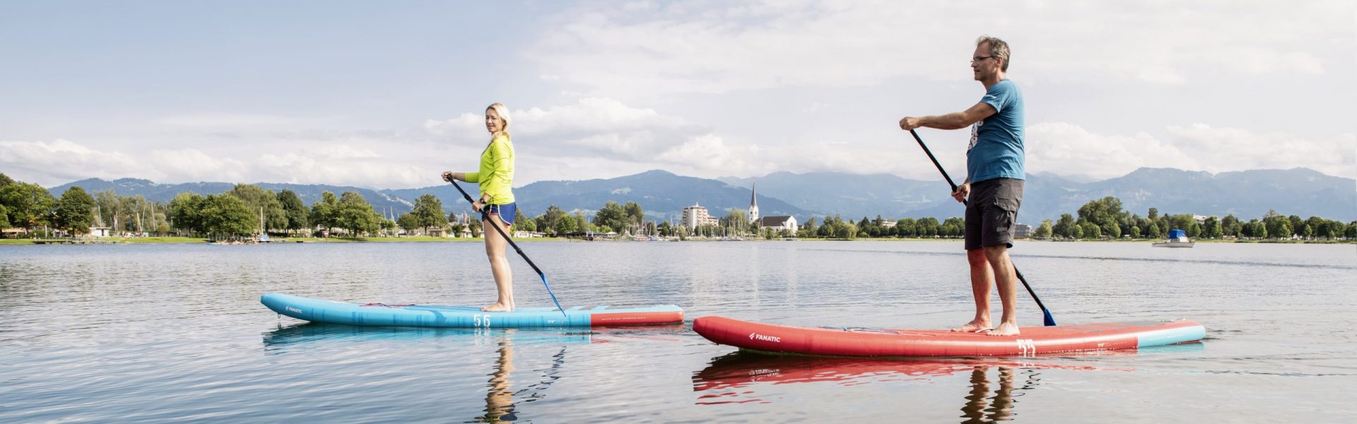 Stand-up-Paddling am Bodensee bietet für jeden etwas: von der Einsteigerrunde im Harder Binnenbecken über die Yoga-Session auf dem Wasser bis zur längeren Tour auf den See hinaus …