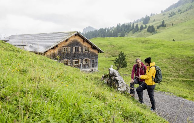 Individuell sind diese Touren ebenfalls machbar. Wobei es neben der Zwei-Stunden- auch eine Tagesrunde mit Start in Au-Rehmen gibt. Mal von der ansprechenden Landschaft abgesehen – erhebend: der Aussichtspunkt Liegstein – wartet an 14 Stationen Input. Typisch für Vorarlberg sind diese dezent gehalten. Um die „Infostellen“ zu entdecken, helfen ein waches Auge, eine Karte und/oder ein Guide. In großen Steinen finden sich kurze, aber informative Texte, die über das Alpleben und die Kulturlandschaft ebenso informieren wie über spezielle Alpen (wie Werners Alpe Sattelegg) oder die Dreistufenwirtschaft im Allgemeinen.