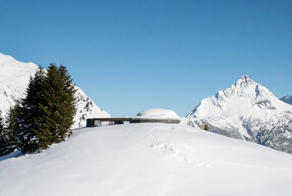 Der Skyspace Lech befindet sich in einem Hügel nahe der Bergstation der Schlosskopfbahn. Hinein geht’s durch einen 15 Meter langen Tunnel. Im runden Raum setzt man sich hin und schaut nach oben. Den Blick nach draußen, auf den Himmel und die umgebenden Berge, gibt eine bewegliche Kuppel frei.