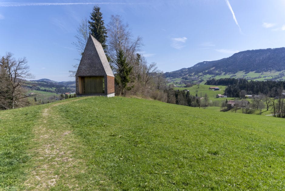 Ein besonderer Raum an einem besonderen Ort. Topografisch reizvoll steht die neue Kapelle des Architekten Bernardo Bader auf einem Nagelfluhrücken nahe den Krumbacher Mooren im Bregenzerwald. Der Sakralbau besitzt ein Schindelkleid aus feinjähriger, wintergeschlagener Lärche, das nach und nach verdunkeln wird wie die alten Bauernhäuser der Region. Die Kapelle ist vom Dorfzentrum zu Fuß in ca. 20 Minuten erreichbar. Im Sommer ist eine frühe Wanderung durch die Moore der Lebensenergie förderlich. Unvergleichlich ist die Ruhe im hölzernen Moorraum – ein Naturerlebnis!