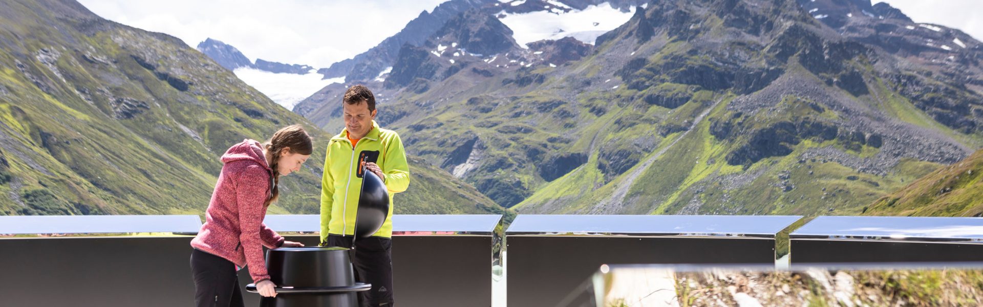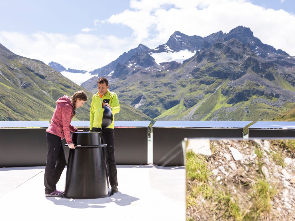 Was seit 2019 auf der Bielerhöhe jedenfalls zum Pflichtprogramm gehört, ist ein Blick in den Schützenschacht. Die Brüstung ist mit hochpoliertem Edelstahl eingefasst, in dem sich Berge, Himmel und Wolken spiegeln. In der Mitte das „Fernrohr“: Deckel öffnen, den Kopf mutig hineinstecken und Licht und Sound auf sich wirken lassen. Fluter, Projektoren, LED-Lines und Lautsprecher nehmen dem Abgrund seinen Schrecken. Am Schluss ist man verzaubert, von der Kunst und von der Natur.