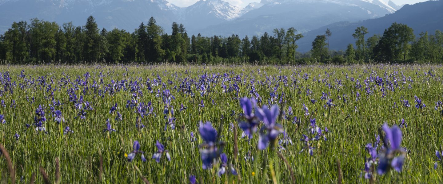 Noch vor wenigen Jahrzehnten zog sich über die Riedwiesen im Rheintal im Frühsommer ein leuchtendes violettes Band durch die Blüten von Millionen Sibirischen Schwertlilien (Iris). Durch den steigenden Flächenverlust und die intensivere Nutzung vieler Gebiete finden sich heute nur noch Reste dieses einstigen Blütenmeers in Vorarlberg. Ein besonderes eindrucksvollen Vorkommen findet sich noch im Europaschutzgebiet Bangs-Matschels in Feldkirch. Neben den wunderschönen Schwertlilien bietet dieses Schutzgebiet im Dreiländereck zwischen Alpenrhein und Ill wertvollen Lebensraum für zahlreiche seltene Schmetterlinge, Reptilien, Amphibien und einige der seltensten Vogelarten Österreichs. Aus diesem Grund ist es hier besonders wichtig, dass wir äußerst vorsichtig im Gebiet unterwegs sind. Zu Fuß oder auf dem Fahrrad lassen sich die Besonderheiten aus der Tier- und Pflanzenwelt von den Wegen aus bestens genießen.
