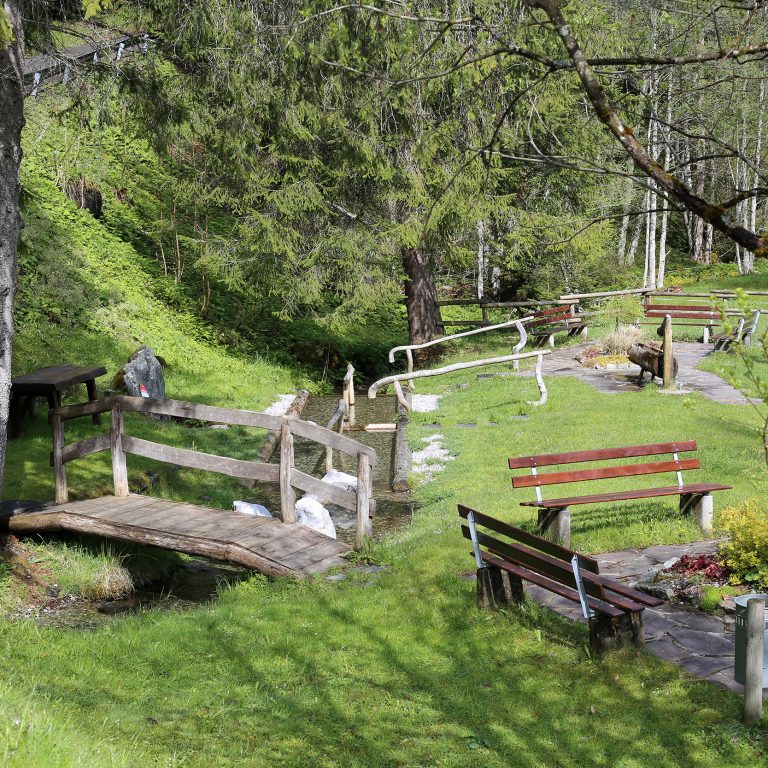 Angekommen an der Kneippanlage Brönna erfrischt das kristallklare Bergwasser die angestrengten Füße der Wanderer. Der zauberhafte Platz bietet eine Wassertretanlage direkt im Bach, ein Armbad im Brunnen und Holzbänke zum Entspannen und Ausruhen – mit Blick auf liebevoll angelegte Blumenbeete. Auch die beiden Kinder Anna und Aaron lieben diese abwechslungsreichen Ausflüge. Und Akira, der Hund der Familie, kann sich nach Herzenslust austoben, abkühlen und Spannendes erschnüffeln.