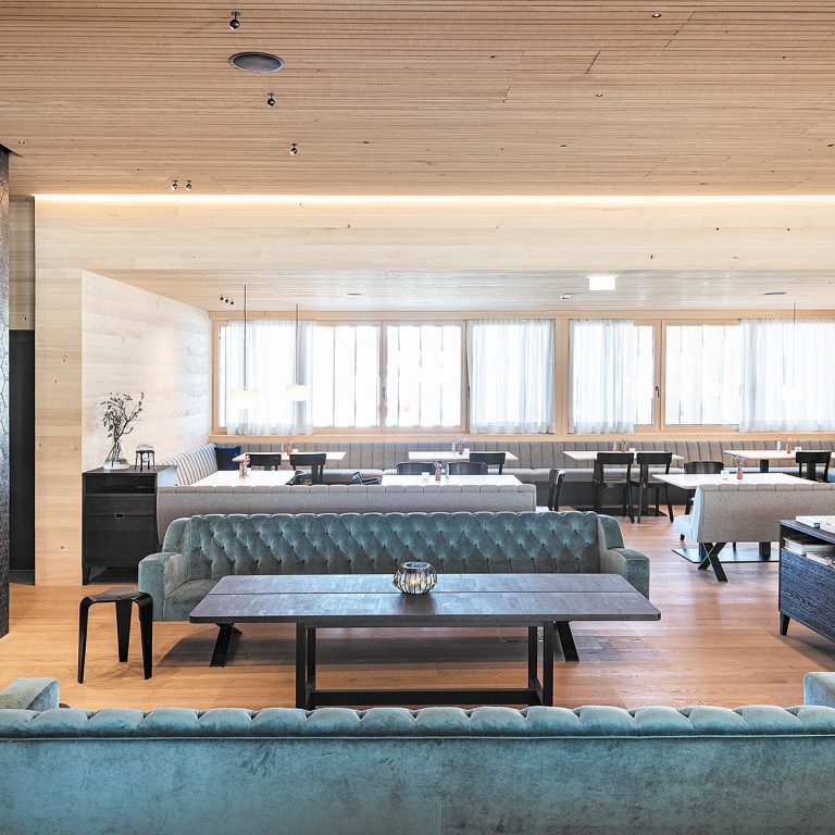 Als Anleihe für die bauliche Übersetzung ihres Ganzjahreskonzepts dient das traditionelle Vorsäß – eine kollektiv bewirtschaftete Ansammlung von Hütten und Ställen zwischen Tal und Alpe. Analog dazu bilden einfache Holzbauten mit Satteldach eine lose, von Gelassenheit getragene Formation. Umso raffinierter tut sich die innere Welt dieser Bauten in bewährter Holzbaukunst auf: Im zentralen Gastraum des Haupthauses heißt ein großzügiger Holztisch willkommen, bei Bar und Lounge vor dem Kachelofen mischen sich Jung und Alt, Hausgäste und Ausflügler. Auch die SeminarteilnehmerInnen vom ersten Stock gesellen sich dazu, können auswählen zwischen intimeren Stuben oder großem Speiseraum. Das Ambiente ist hell und freundlich, die Ausführungsqualität und die eingesetzten Materialien sind hochwertig und die Beleuchtung schafft abends wohltuende Atmosphäre.