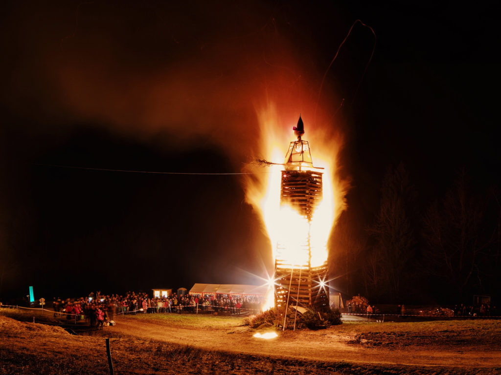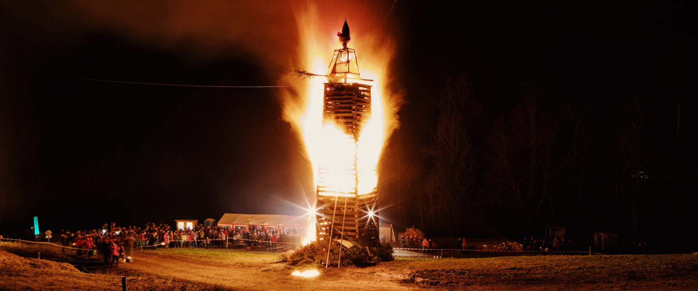 Funken abbrennen hat in Vorarlberg eine lange Tradition und auch heuer wird in vielen Orten der von der Funkenzunft kunstvoll aufgeschichtete, zum Teil bis zu 30 Meter hohe Holzturm – der Funken – gezündet. Höhepunkt ist die Explosion der Funkenhexe ganz oben auf der Spitze.