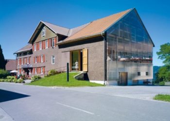 Schon von außen erkenne ich, dass hier Tradition und Moderne Einzug gefunden haben. Der Wirtschaftsteil des ehemaligen Gasthaus Krone wurde vom Architekten Gerhard Gruber modernisiert und auf die Bedürfnisse der Werkstatt angepasst. Um dem Innenleben des also ursprünglich eher verschlossenen Gebäudes mit Holzfassade das nötige Licht zu verschaffen, wurde die Verkleidung der Nordostwand entfernt und durch riesige Schindeln aus Glas ersetzt. So flutet Tageslicht durch das alte Gebälk des Fachwerks direkt in fast alle Arbeitsbereiche der Werkstatt. Eines muss man den Bregenzerwäldern wirklich lassen: Für gute Architektur haben sie wirklich ein ganz besonderes Gespür, das sich auch ins Innere des Gebäudes zieht. Die Nähwerkstatt, eine Art langgezogener moderner Kubus mit Vitrinen an der Seite schwebt geradezu im zweiten Stock.