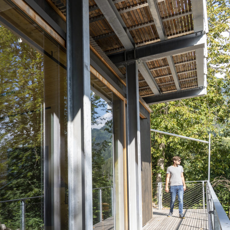 Inmitten schattenspendender Bäume mit Panoramablick auf die Berge beeindruckt in Thüringerberg im Biosphärenpark Großes Walsertal der Kulturpavillon Blumenegg.