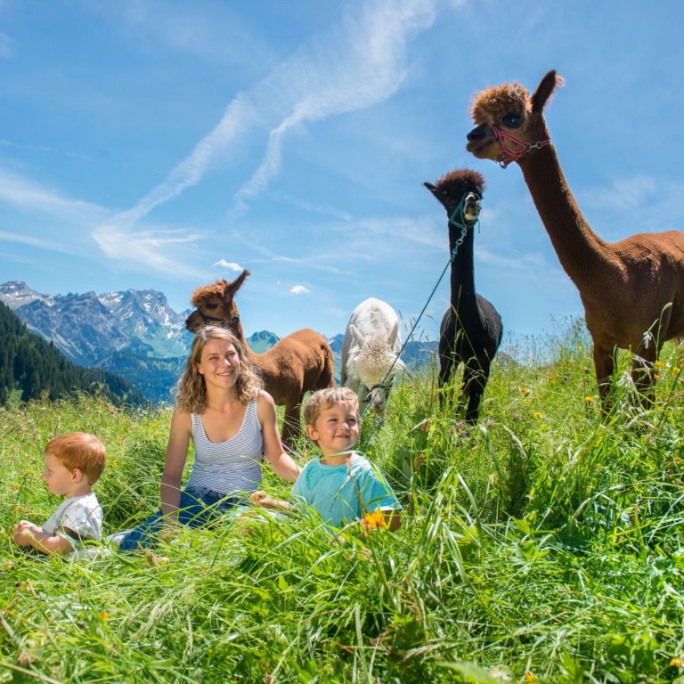 Familienerlebnis in Vorarlberg: Aussichtsreich und kurzweilig für Groß und Klein ist eine Wanderung mit Lamas und Alpakas.