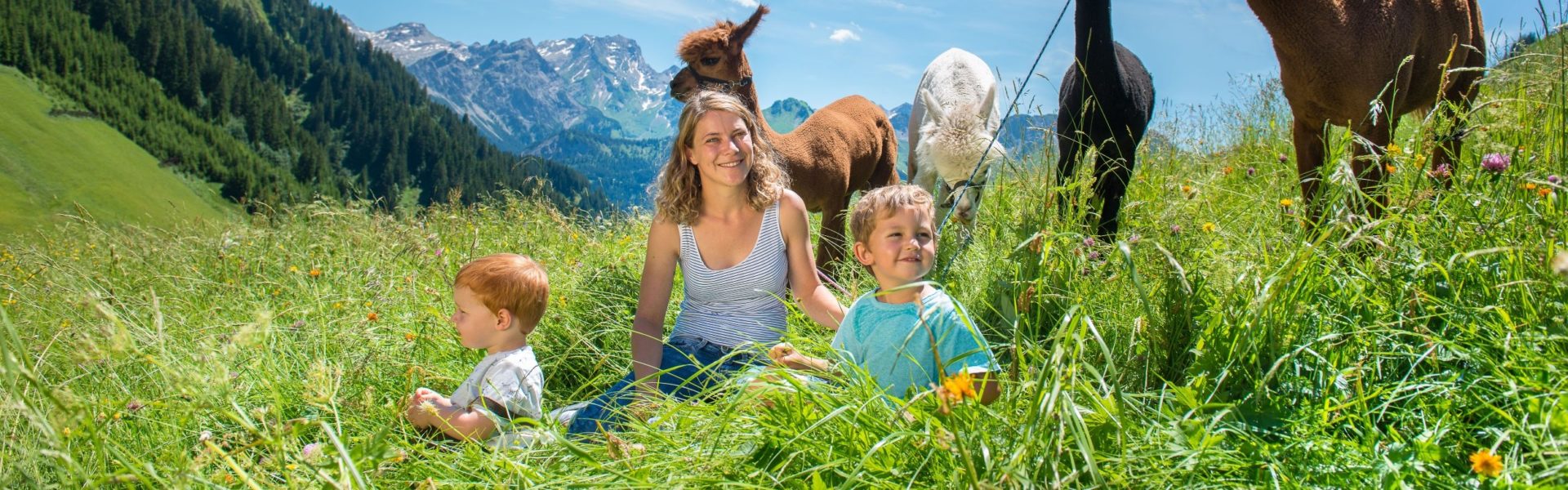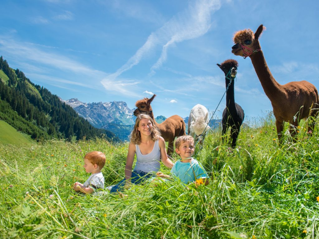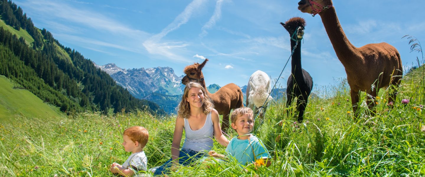 Familienerlebnis in Vorarlberg: Aussichtsreich und kurzweilig für Groß und Klein ist eine Wanderung mit Lamas und Alpakas.