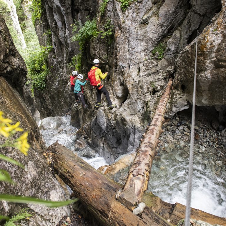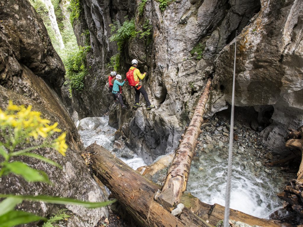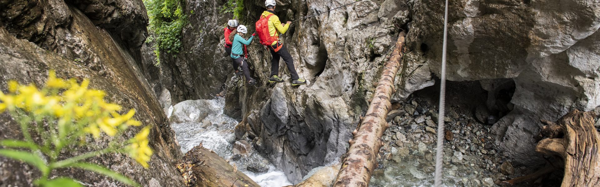 Der Klettersteig durch die Röbischlucht führt am Wasser entlang, mal direkt darüber, mal mitten durch. Klingt aufregend, ist es auch. Selbst Einsteiger kommen in den Genuss!