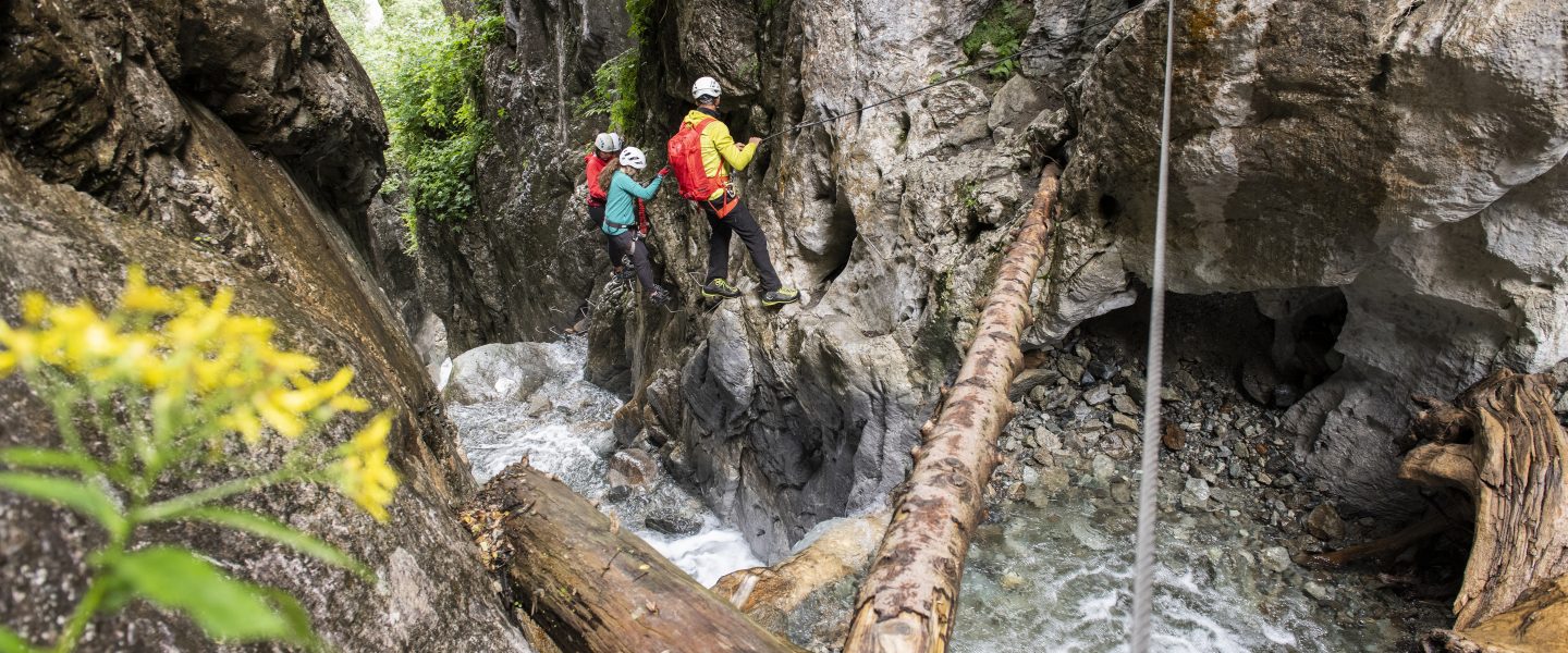 Im Rätikon, Verwall und der Silvretta warten insgesamt 24 Klettersteige. Ein ganz besonderer befindet sich bei Gargellen, dem auf 1.423 Meter gelegenen Luftkurort am Ende des Gargellentals, genauer gesagt in der Röbischlucht. Allein das Setting ,wenn der Röbibach durch hohe Felswände schwappt, hier gurgelt und dort Gumpen bildet, begeistert. Das Beste aber: Durch die Klamm führt eine Via Ferrata, die sich dank Schwierigkeitsgrad B/C auch für Kinder und Einsteiger eignet. Einer, der Gruppen mit Vorliebe durch die Schlucht führt, ist Edwin Düngler. Und wenn die Bedingungen stimmen – trockenes Wetter, kein Gewitter in Sicht, von Hochwasser ganz zu schweigen – kommt der 55-jährige Sunnyboy mit der sonnengegerbten Haut gar nicht mehr raus aus dem Dauergrinsen. Das steckt an. Gute Laune herrscht dann schon am Parkplatz in Gargellen und beim rund 20-minütigen Zustieg. Dort heißt es das Klettergurtset zurechtzupfen, Helm aufsetzen und Hand anlegen an den Fels. Schwer ist das nicht. Nach einer Weile reicht das nicht mehr, dann gibt Edwin die Devise für die nächste Dreiviertelstunde aus: „Am Seil einklinken, und zwar immer doppelt!“ Bestens gesichert, auch dank festem Eisenhalt unter den Füßen, geht es an der Felswand entlang.