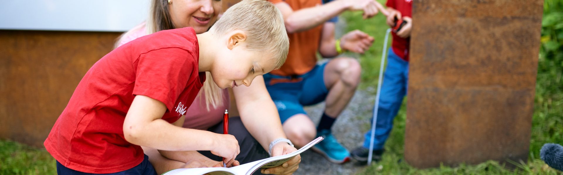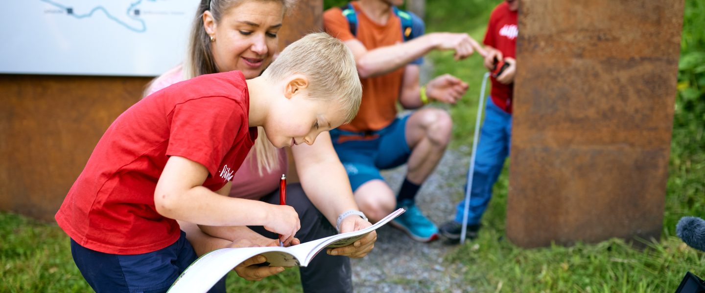 = Montafoner Kinderwege. Ausgestattet mit Maßband, Fernglas, Stoppuhr, Kompass und Lupe begeben sich Kinder und Familien im Montafon auf besondere Entdeckungsreisen.