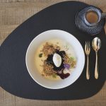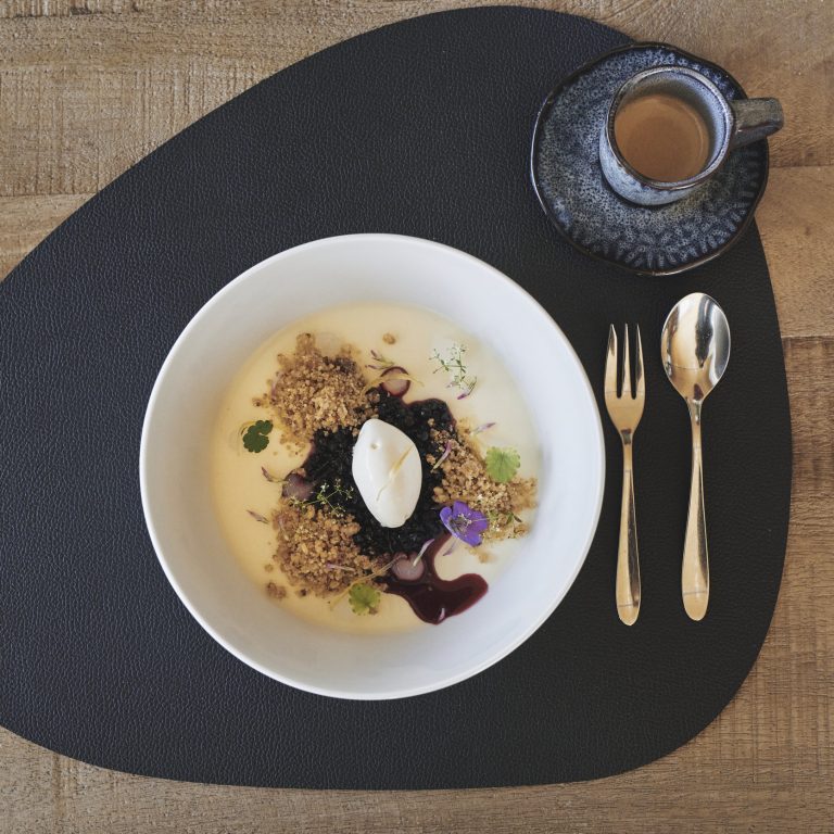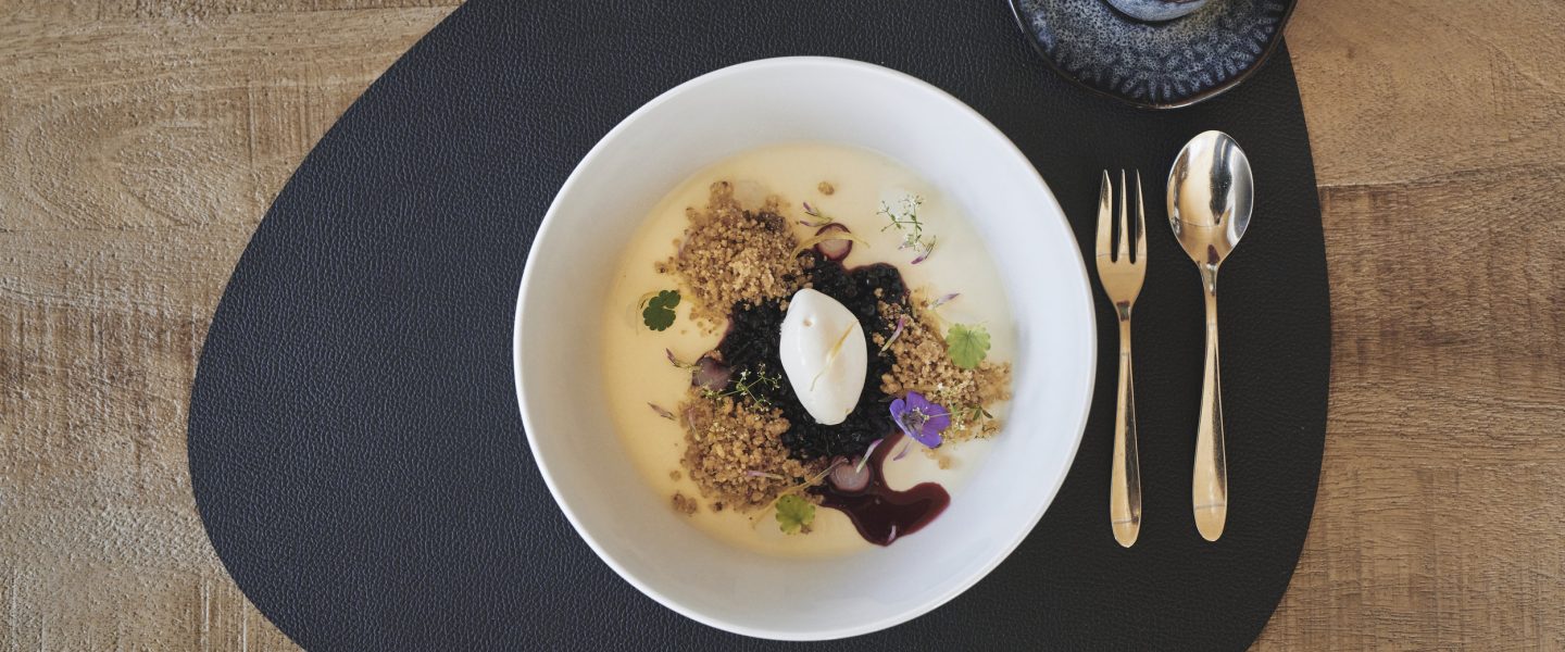 Holunderbeerenkompott und Cookiecrumble auf der Pannacotta verteilen. Mit Zitronen-Thymmian-Gel und Zitronenzesten verzieren.