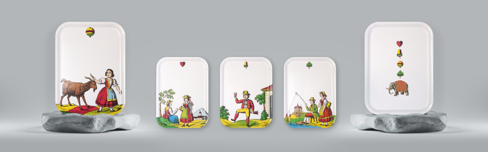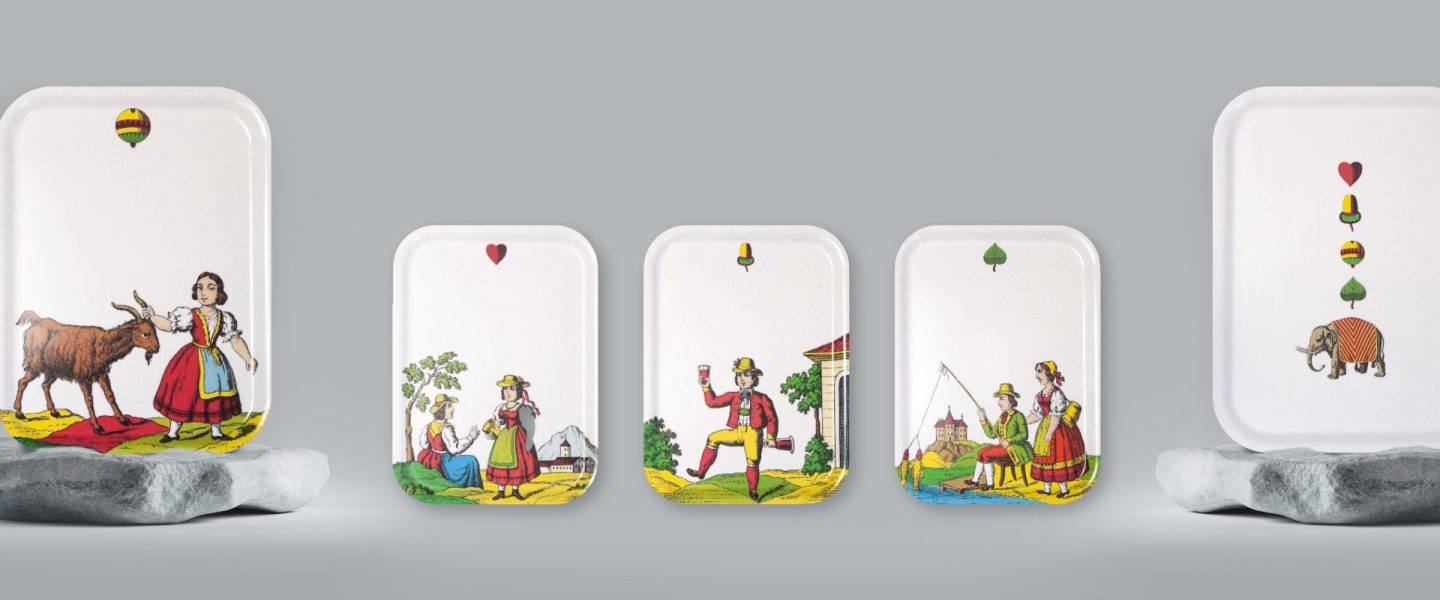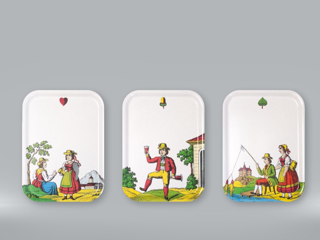 11 Vorarlberg-Motive auf Tabletts: mit Illustrationen der original Jass-Karten, mit dem Bregenzer Milchpilz, Skifahren oder Retro-Tourismusplakaten