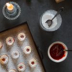 Auf die Kekse ohne Loch etwas Marmelade geben und verstreichen. Anschließend einen Keks mit Loch darauf setzen und leicht andrücken.