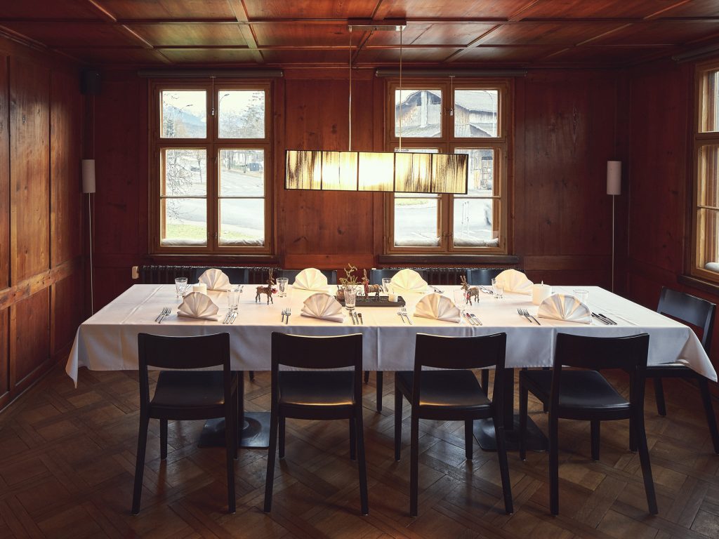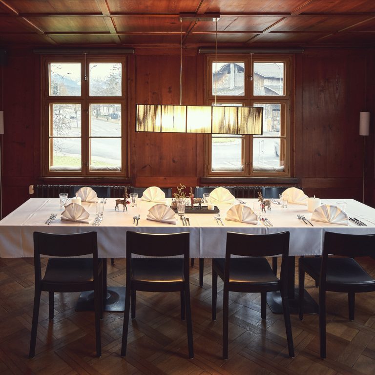 Trotz längerem Leerstand blieben Haus und Stuben erstaunlich intakt. Eine gelungene Zusammensetzung von neuem Eigentümer, Architekten und Pächter erwies sich als Glücksfall für das Haus, das ist durch und durch spürbar. Dank einer klugen Sanierung (2010) halten sich Altes und Neues die Waage. Zum einen kann das Haus stirnseitig sein schön gealtertes Gesicht bewahren und in den zwei original getäferten Stuben von einer anderen Zeit und Lebensweise erzählen. Zum anderen schaffen eine neue Innentreppe und der Ausbau des anschließenden Stadels geschickte Durchblicke und Nutzungsvarianten. Der Stadel wird zum eigenen Atelier der planenden Architekten, zur gekonnten Umdeutung in eine moderne Erscheinung. Eine transluzente Hülle aus Doppelstegplatten schützt das historische Gebälk und Gemäuer und bildet einen klaren Kontrapunkt zum geschindelten Vorderhaus.