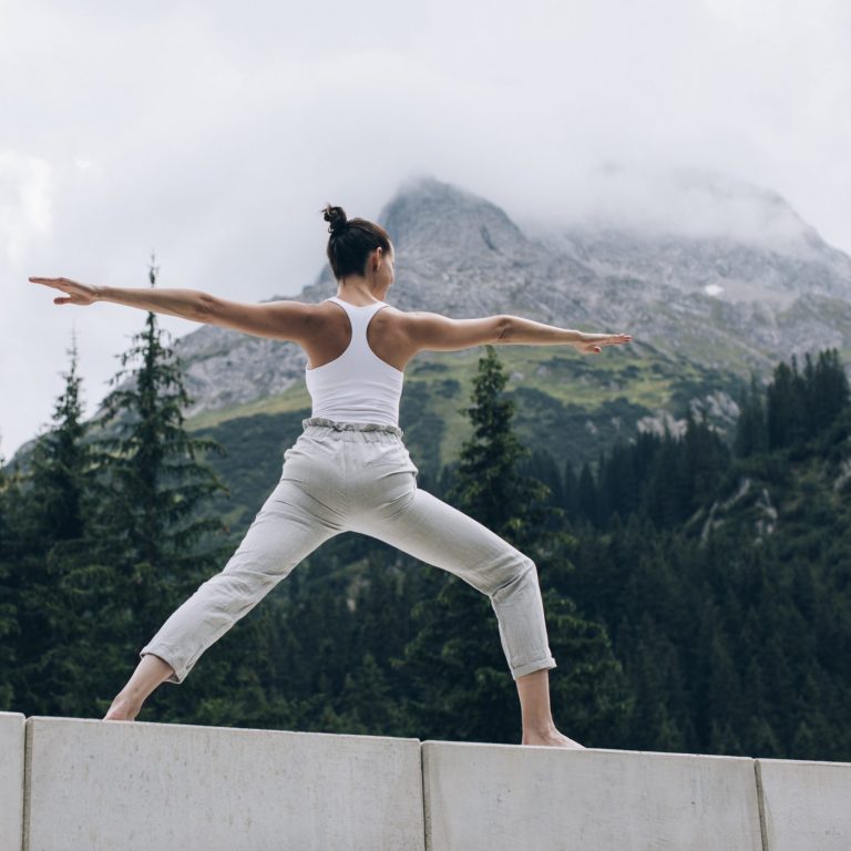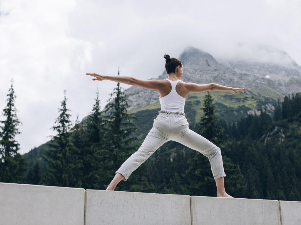 Ines Hinteregger kombiniert Yogaübungen mit der Kraft heimischer Heilpflanzen – Ausblick auf die Berge und die Natur des Bregenzerwaldes inklusive.