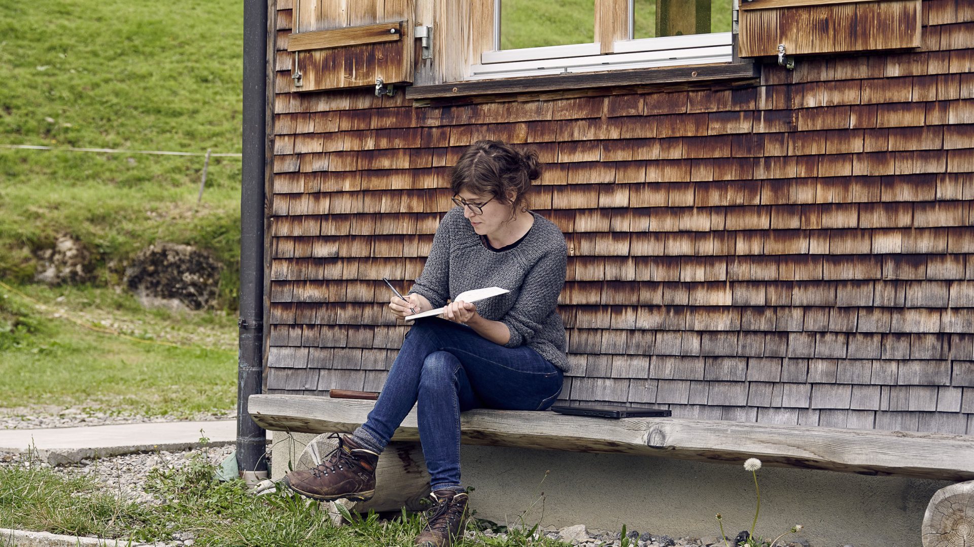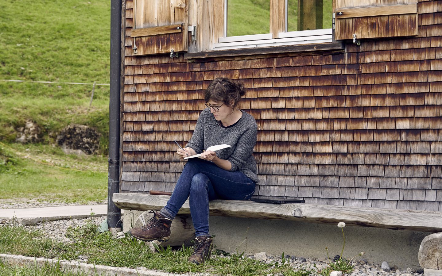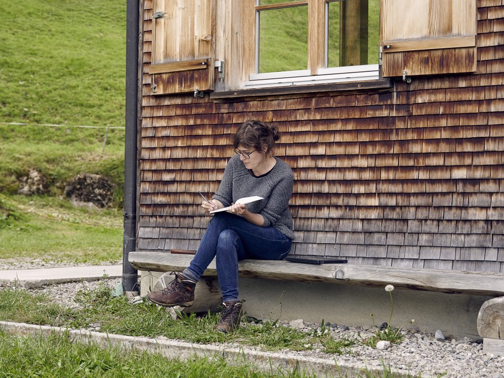 Am liebsten schreibt Lisa-Viktoria auf der Holzbank draußen vor dem Haus, mit Blick auf die Winterstaude. Für die kleine Chiara war es anfangs schwer zu verstehen, warum der Besuch statt wie die anderen Käse zu machen, das Vieh zu versorgen oder Zäune zu reparieren mit Laptop oder Notizbuch auf den Knien so oft „nur da sitzt und schaut“. Doch auch das gehört zum Schreiben dazu: das Sinnieren und das Beobachten. „Es ist eine bereichernde Erfahrung für mich, einem Kind zu erklären, was genau ich mache“, sagt die Autorin. „Das gibt mir noch einmal eine andere Perspektive auf meine Arbeit.“ Zudem erweitern die Gespräche auf der Holzbank ganz nebenbei den Bregenzerwald-Wortschatz der Oberösterreicherin. „Ich habe gelernt, dass ich ein Wib und keine Schmelg mehr bin und dass man hier Bschütte auch schmecken kann*“, lacht sie.
