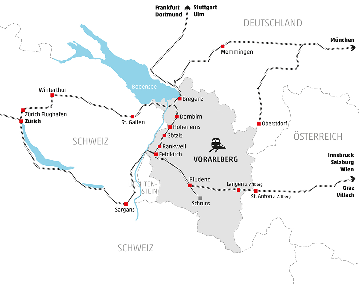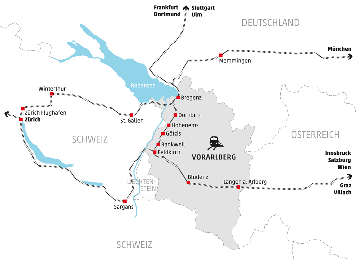 Weitere Verbindungen: Regelmäßige Nightjet-Verbindung von Hamburg-Altona nach Innsbruck. Von dort geht es direkt mit EC- oder Railjet-Verbindungen nach Bregenz oder Feldkirch/Bludenz: www.nightjet.com.
