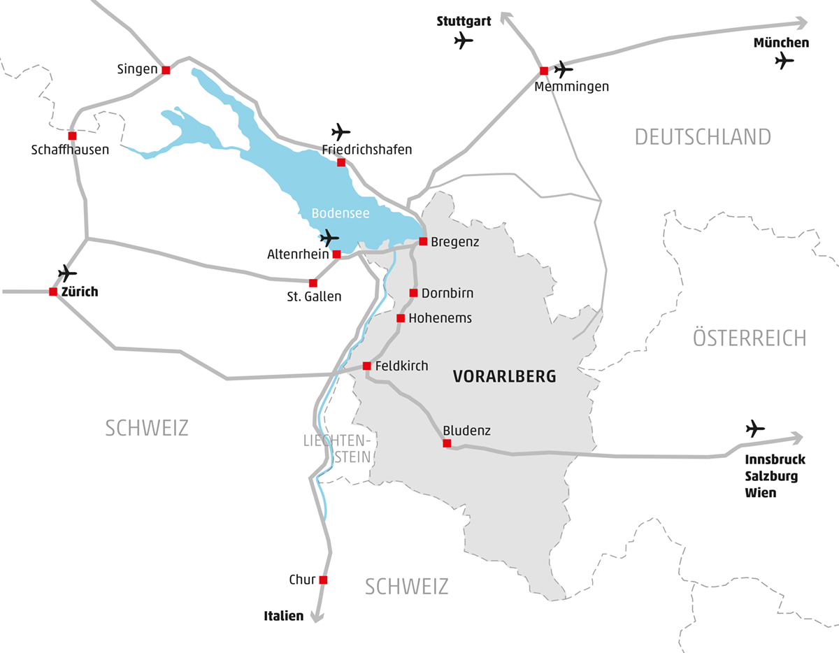 Für die Anreise mit PKW aus Deutschland, der Schweiz und Österreich führen Autobahnen nach Vorarlberg.