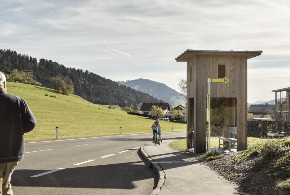 Das 1000-Einwohner-Dorf Krumbach liegt eingebettet in der wunderschönen Vorarlberger Landschaft. Baukultur und solides Handwerk haben hier Tradition, unschwer erkennbar schon am properen Gemeindeamt und dem Pfarrhaus. „Außerdem spielt der öffentliche Personennahverkehr bei uns im ländlichen Raum eine wichtige Rolle“, sagt Arnold Hirschbühl, weit gereister und dabei umso mehr in seine Heimat verliebter Altbürgermeister des Dorfes, „jede halbe bis ganze Stunde fährt hier der gelbe Landbus.“ Als dann die Erneuerung der sieben Busstationen der Gemeinde überfällig war, entstand am Stammtisch eine verwegene Idee: die Themen Baukultur und Alltagsmobilität zu verbinden, Zeichen zu setzen gegen eine Reduzierung des „nicht rentablen“ Busverkehrs in ländlichen Gebieten – und zugleich die weite Welt der Architektur nach Krumbach zu holen.