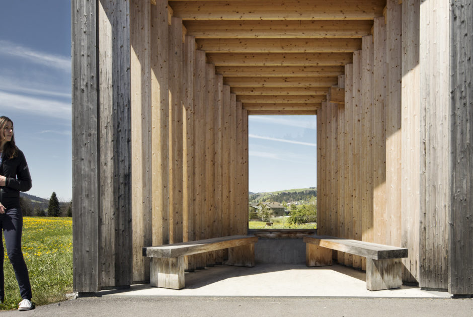 Zwischen vielen der Akteure sind heute Freundschaften entstanden. Und kulturinteressierte Urlauber schauen vorbei, freuen sich an den teils skurrilen Entwürfen. Und die könnten unterschiedlicher kaum sein. Die Bandbreite der neuen Buswartehüsle reicht vom gläsernen Pavillon mit schwarzer Betondecke und Bauerngestühl des Chilenen Smiljan Radic (Haltestelle „Zwing“) über eine Station aus Holzstapeln des spanischen Ensamble Studio (Haltestelle „Unterkrumbach Nord“) bis zum Metallgebilde der belgischen Architekten De Vylder Vinck Taillieu („Unterkrumbach Süd“). Den Vogel aber schießt der Entwurf des Japaners Sou Fujimoto ab (Haltestelle „Bränden“), ein Wald aus weißen, 4,5 Zentimeter starken Stahlstangen, zwischen denen sich eine schmale Treppe gen Himmel schraubt – Wetterschutz gleich Null, aber von oben genießt man einen tollen Blick und sieht den Bus schon von weitem kommen. „Aus baurechtlichen Gründen mussten wir da eine Tafel ,Betreten verboten’ anbringen“, so Altbürgermeister Hirschbühl, „aber das Schild ist dann ganz schnell wieder verschwunden …“