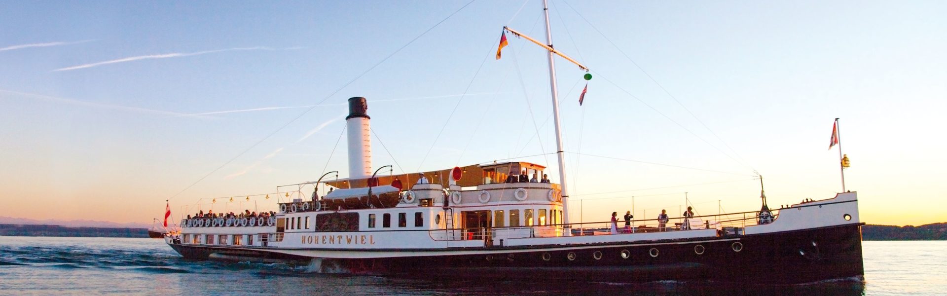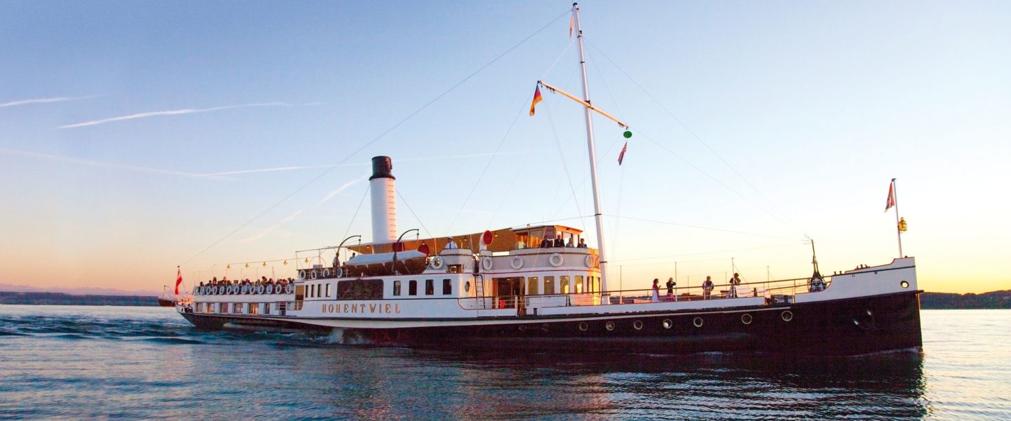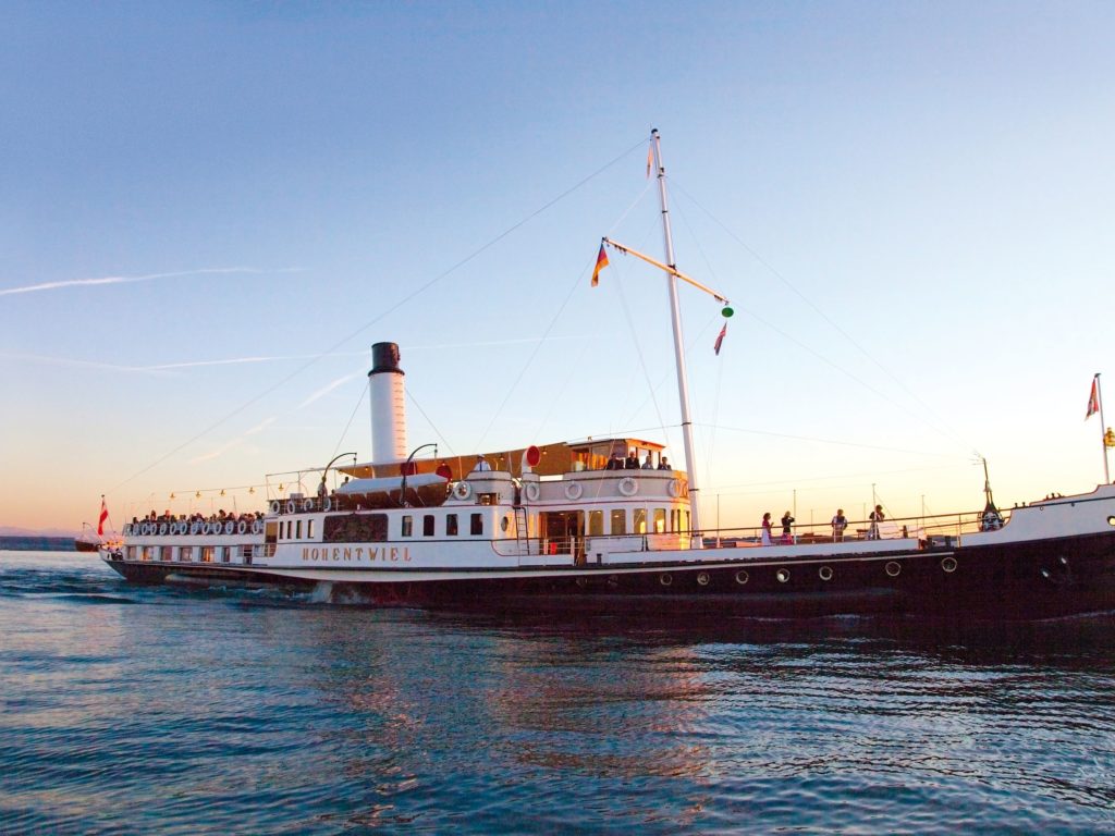 Stilvoller kann man auf dem Bodensee dem Sonnenuntergang nicht entgegenfahren: Auf dem aufwändig renovierten Raddampfer werden u. a. auch Gourmetfahrten angeboten. An Bord serviert Küchenchef Heino Huber dann ein 5-gängiges Menü.