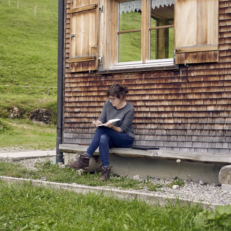 Lisa-Viktoria’s favourite place to write was on the wooden bench outside the house that looked on to the Winterstaude. Little Chiara found it initially difficult to understand why, instead of making cheese, tending to the livestock or repairing fences like the others, the visitor often “just sat there staring out into the distance with a laptop or notebook on her knees”. But that’s also part of writing: looking and pondering. “It was a rewarding experience for me to explain to a child exactly what it was I did,” the writer said. “It opened up another perspective on my work for me.” The conversations on the wooden bench also had the unintended effect of expanding the Upper Austrian’s grasp of the vocabulary used in the Bregenzerwald. “I learned that I’m a ‘Wib’ (‘woman’) and not a ‘Schmelg’ (‘girl’) any more, and that you can ‘taste Bschütte’ here too*,” she said, laughing.