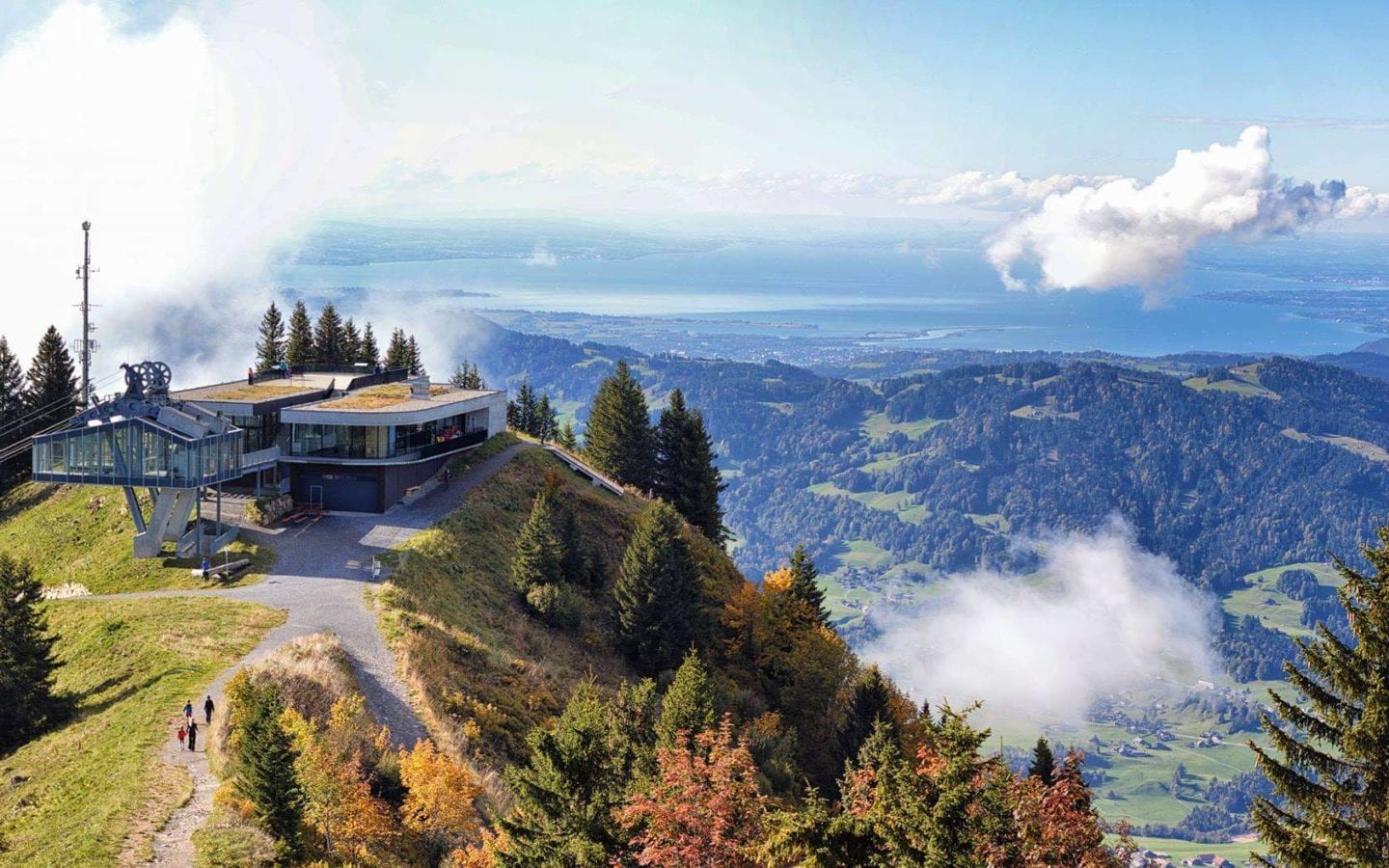 C Panorama restaurant Baumgarten, view of the Rheintal valley, Vorarlberg cable cars, autumn (c) Seilbahn Bezau cable car