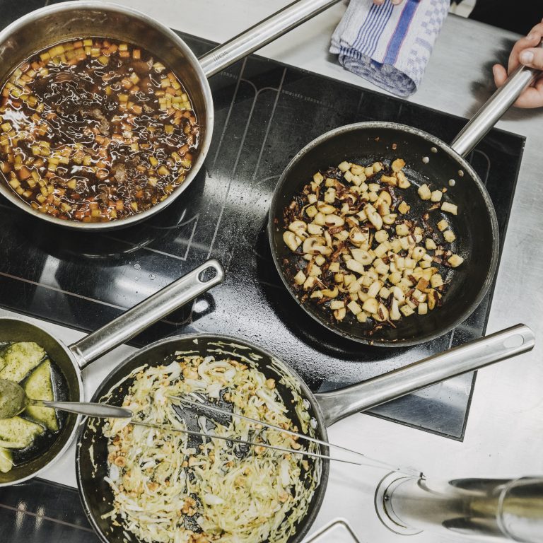 Place the cut out celery coins on a work surface and place the mashed potatoes in the centre of the coins. Fold the celery coins in half and press the ends. Thanks to the celery’s high starch content, these will hold without binding substances.