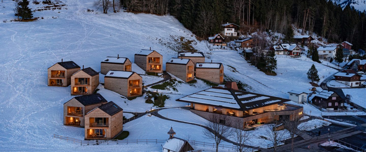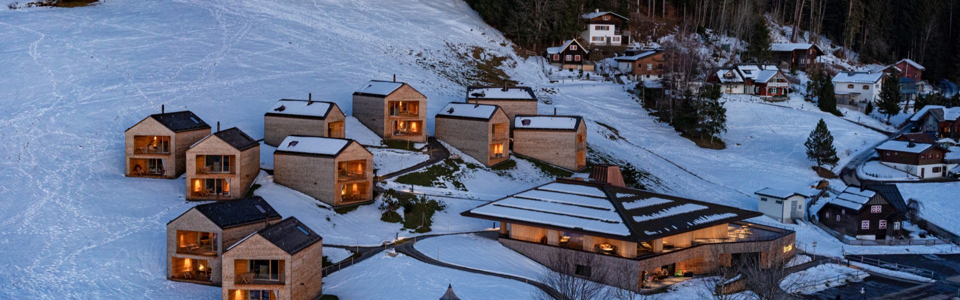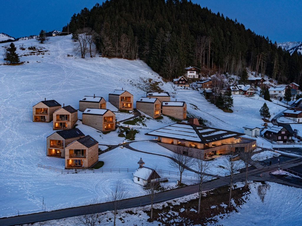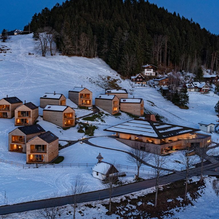 As far as the concept is concerned, the construction of ten chalets that are carefully being composed into the slope is breaking new ground. Their language of design is based on the contemporary Vorarlberg art of timber construction – compact, straightforward and perfectly detailed – the top-notch craftsmanship and high-quality materials guarantee a pleasant and soothing atmosphere on the inside while the outdoor seating area offers comfort and presents a mountain panorama that seeks its equal. Guests looking for a bit of peace and quiet will enjoy the room service with an individually stocked breakfast box or dinner for two. While they’ll also appreciate the anti-throwaway philosophy.