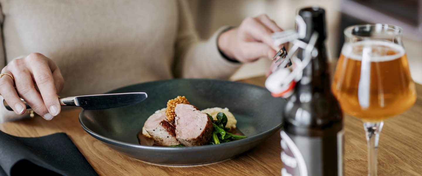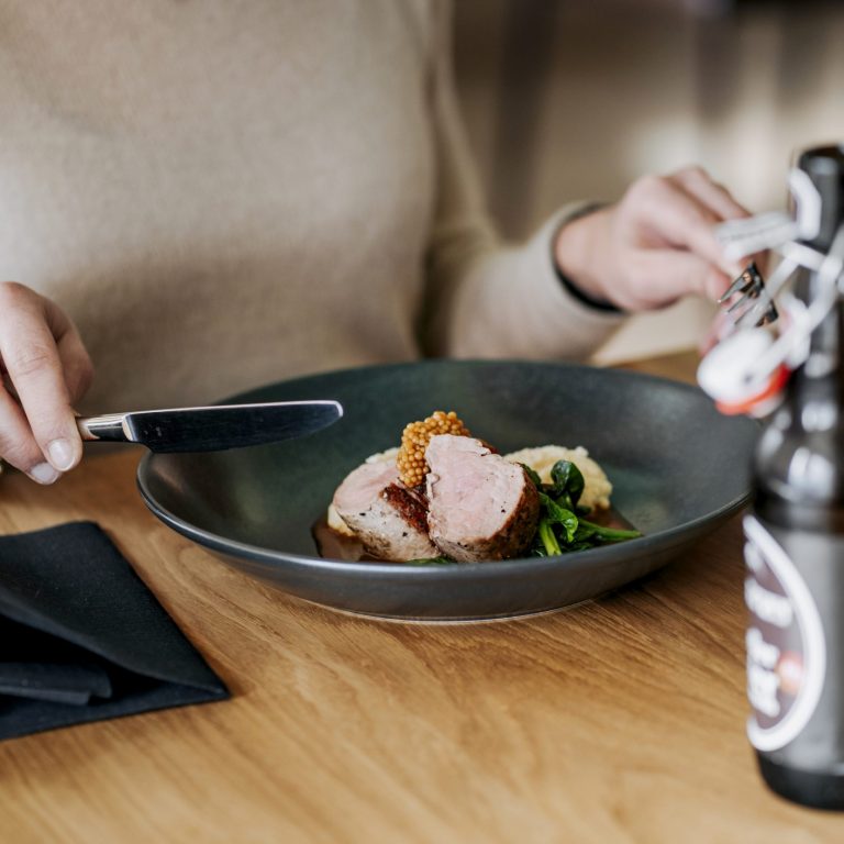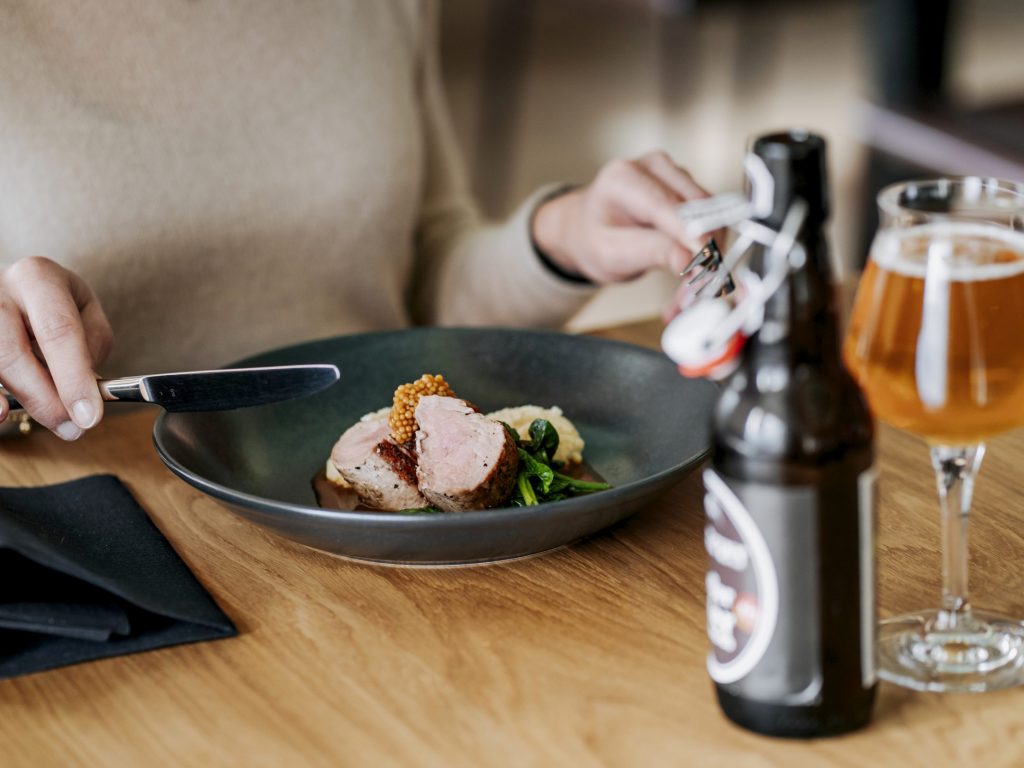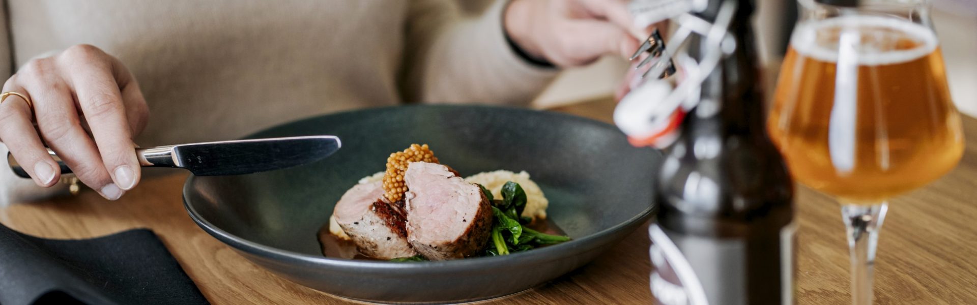 Pork tenderloin with beer jus, Riebel polenta, spinach and mustard caviar