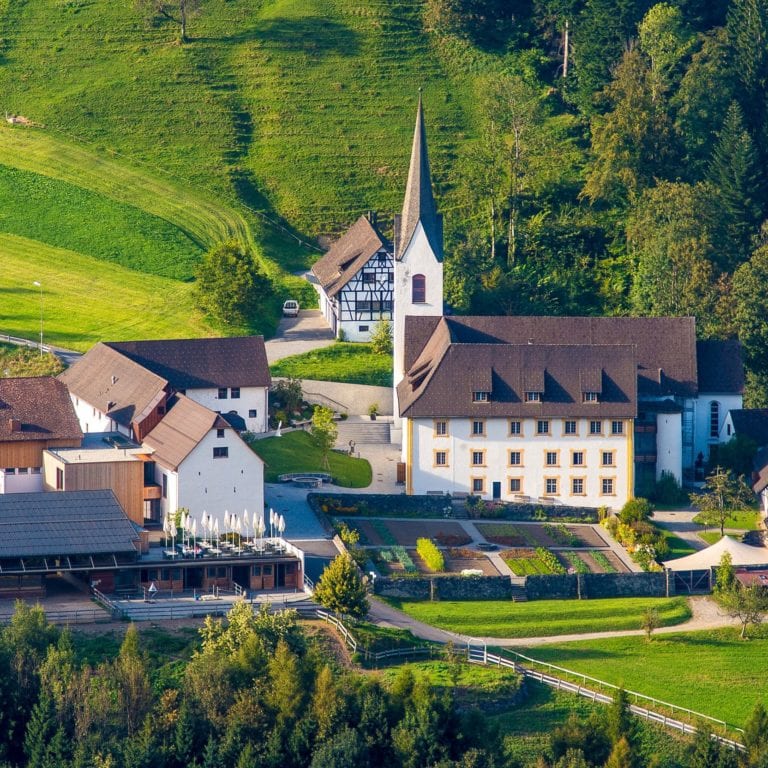 The church’s pointed tower and geometrically arranged buildings are clues to St. Gerold priory’s (Propstei St. Gerold) erstwhile function. Here, in the village of St. Gerold in the mountainous Grosses Walsertal Biosphere Park, there was a Benedictine monastery until the year 1958. The monastery’s affiliation with the Einsiedeln Abbey in Switzerland chronicles 1000 years of history. Those who have a sixth sense for special places will undoubtedly appreciate the spiritual strength here. Today, the property is a meeting and educational centre with restaurant, monastery shop, riding hall, monastery garden, guest rooms and a lively cultural programme.