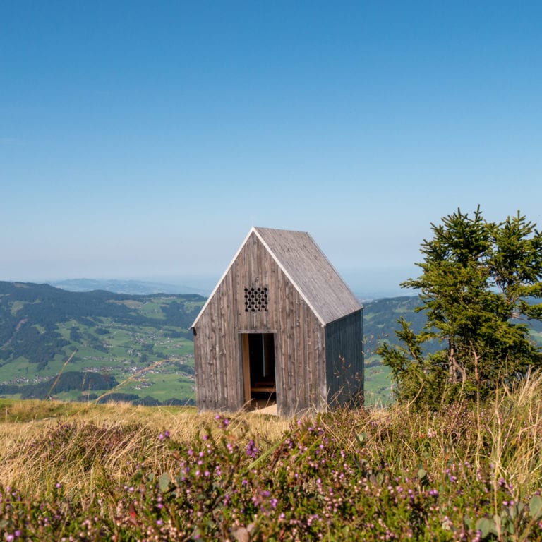 The Niedere is accessible from Bezau via cable car. From the mountain station, the Theodul chapel is just an approx. 15-min walk. Though paragliders oftentimes assemble around the wooden building before takeoff, it’s mostly peaceful here.