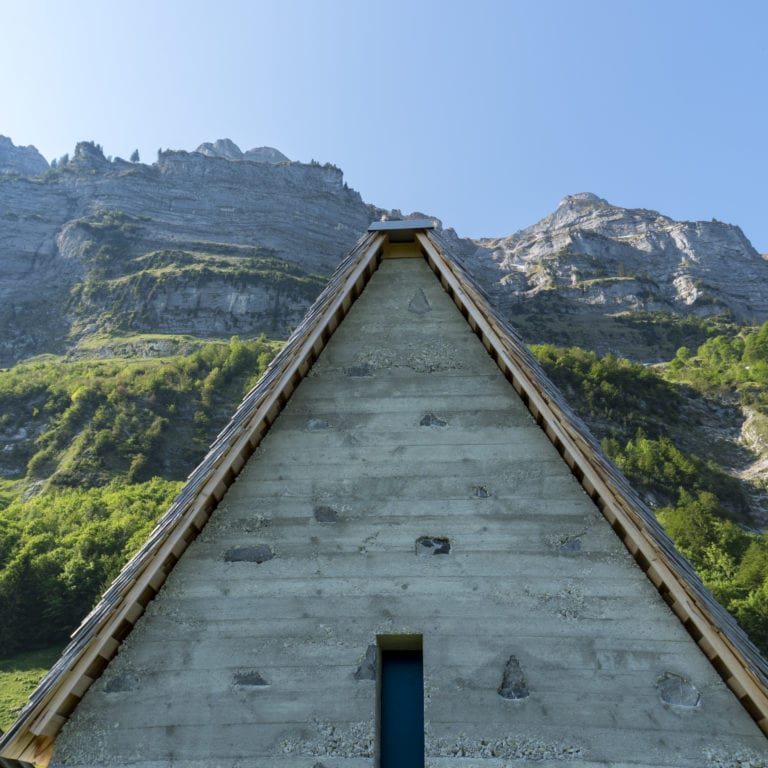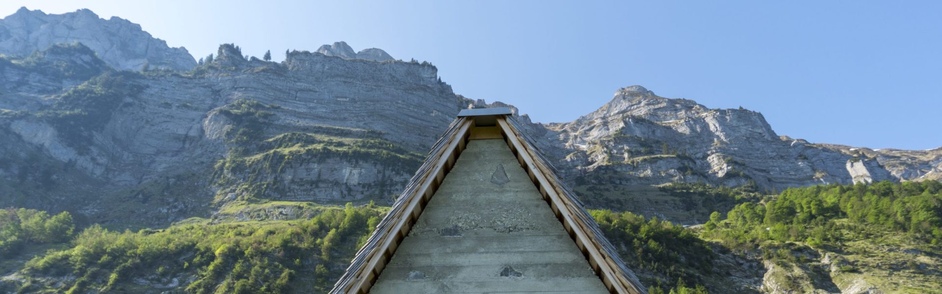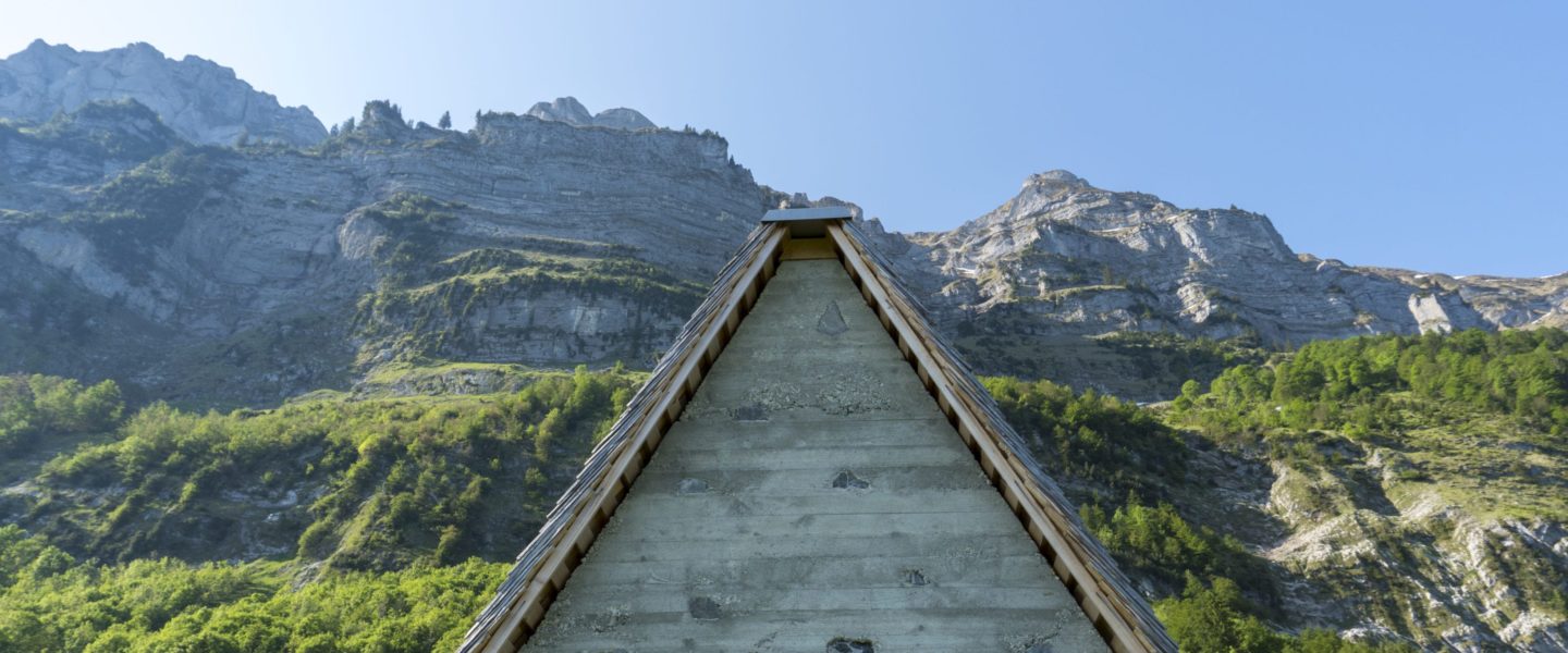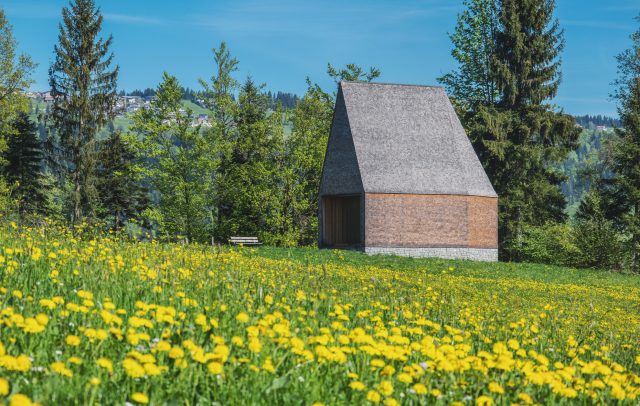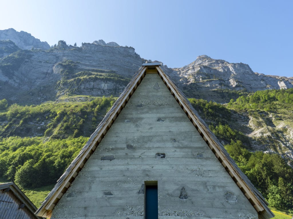 The backdrop of the Wirmboden summer settlement is the 2,044 metre high Kanisfluh mountain. After an avalanche ripped away the temporary summer settlement’s former chapel, residents had architect’s plan and build a new one in 2016.