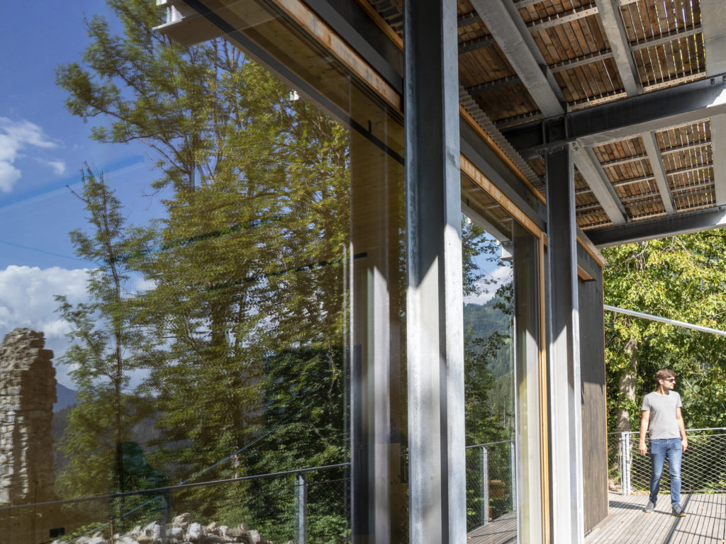 The pavilion was erected on the ruins of Blumenegg castle. Made of wood, glass and steel, the structure features a wooden rooftop terrace and is an ideal venue for cultural events in addition to a meeting place for local associations.