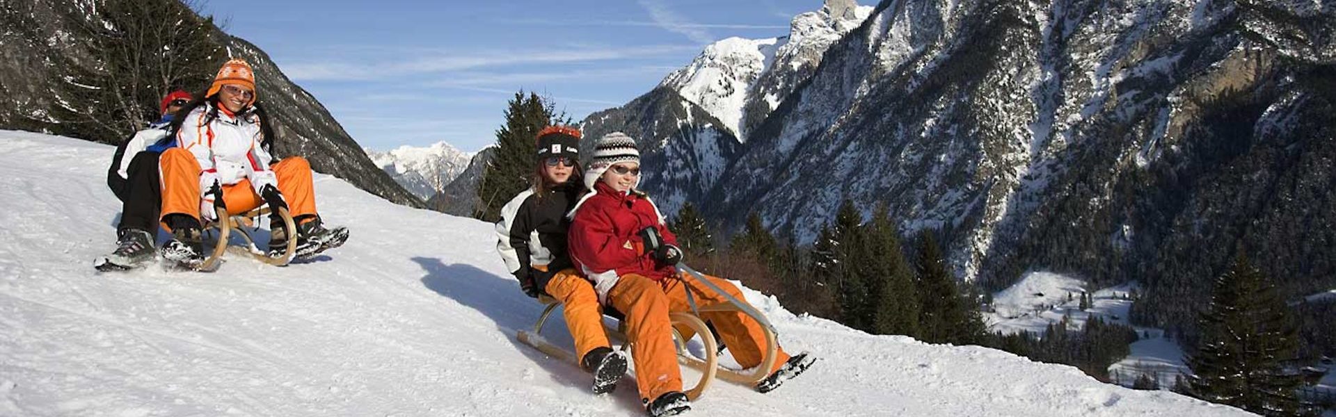 In the Brandnertal valley in Vorarlberg, there is a tobogganing safari that always gives you time to relax between the rapid descents, enjoying the snow-covered landscape and breathtaking views while winter hiking. It leads in two variants from the mountain station of the panorama cable car down to Bürserberg, and you can get back to the starting point by bus. Families can spend the whole day tobogganing, winter hiking and enjoying the wonderful views – between the fast downhill runs there are always quiet passages where you can enjoy the wintry nature and the breathtaking views.